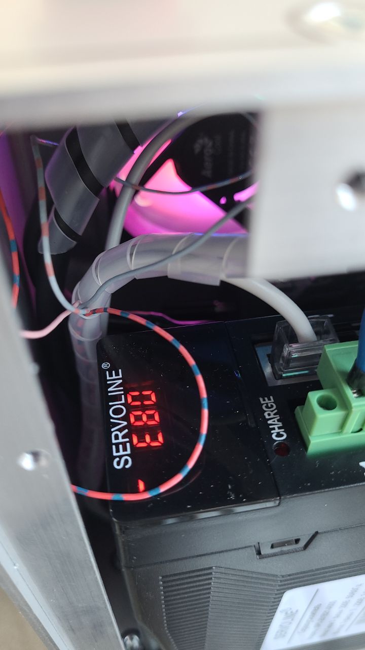 Исключил все вспомогательное оборудование (датчики температуры, концевые выключатели и т.д.), заменены все кабели, отдельно подключил сервоусилитель и сервопривод на столе и через программку запустил цикл пуск-ускорение-замедление-остановка и все тоже самое в обратную сторону.