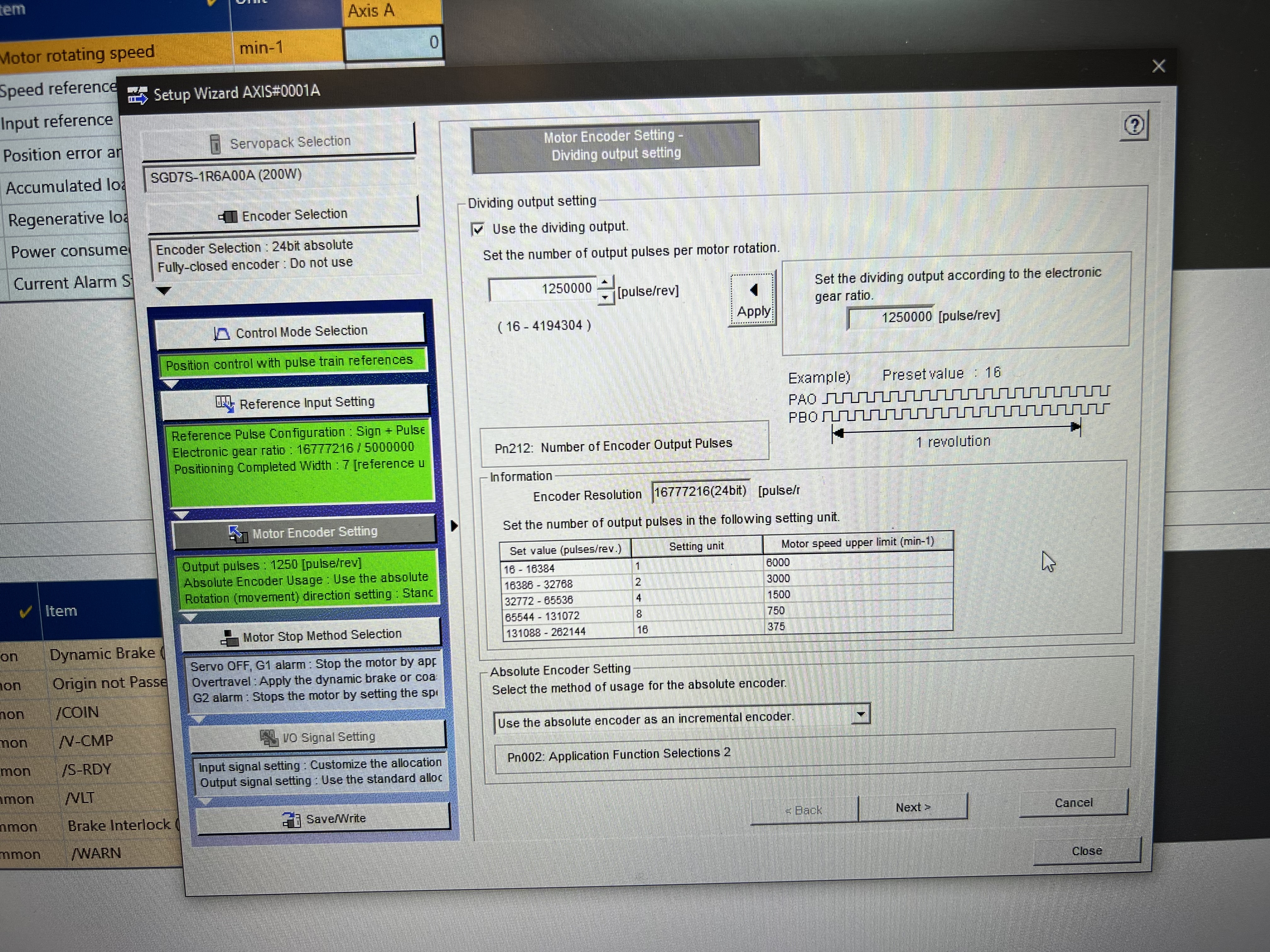Servomotor. Если коротко, это выходные сигналы энкодера с серводрайвера (не с сервомотора), которые можно завести в контролер и т.д.. На конкретную ситуацию они не влияют, это легко проверить, просто поменяв значения параметр Pn212, но после того как поменяете этот параметр не забудьте перегрузить драйвер. Так как этот параметр меняется после перезагрузки драйвера, о чем написано на странице 579. Кстати, параметры Pn20E и Pn210 записываются так же после перезагрузки серводрайвера (очень не удобно, а еще Yaskawa).