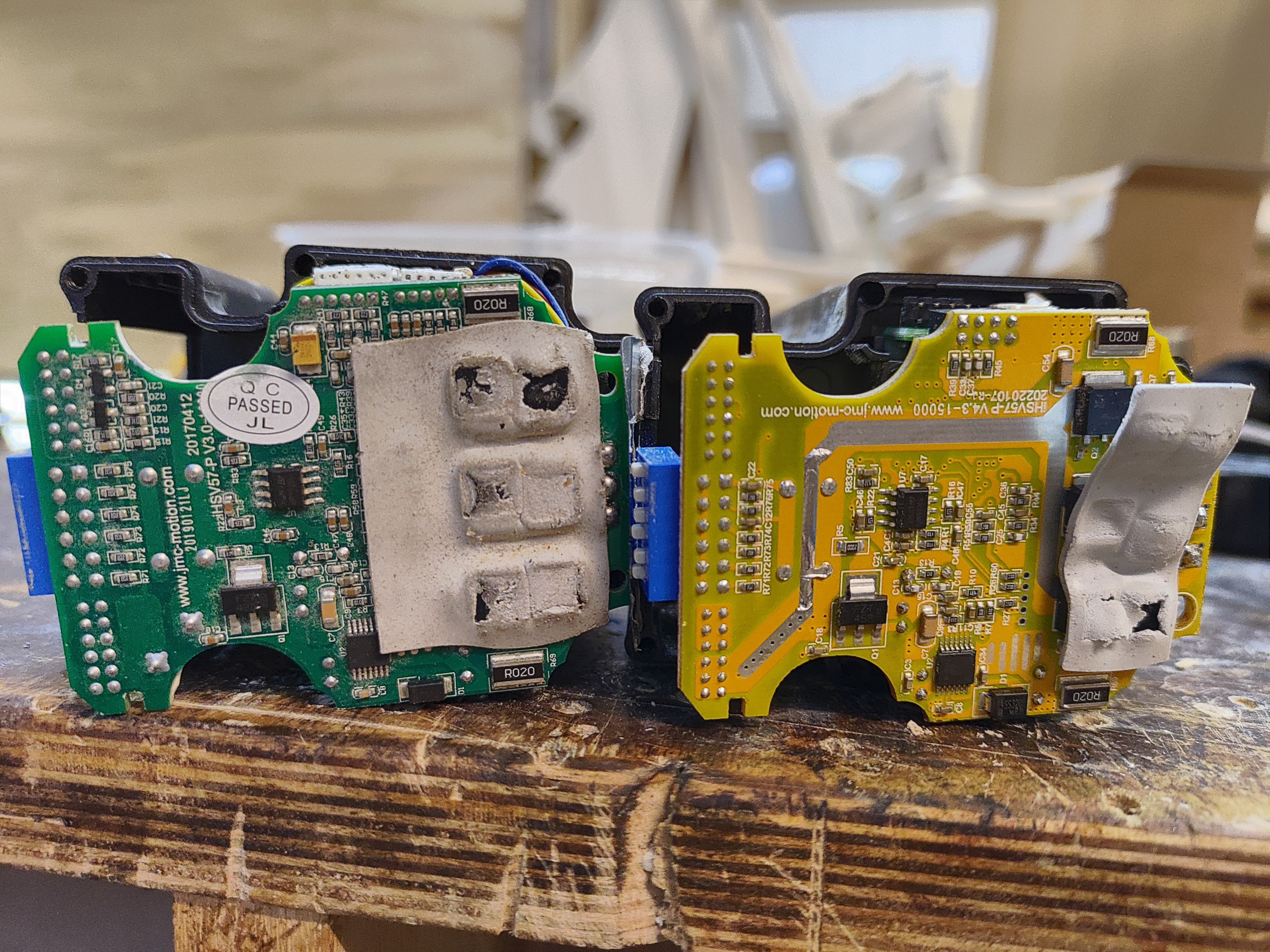 Разобрал двигатели. Сдох, оказывается, тот, что куплен в апреле-2022, viewtopic.php?p=634434#p634434. Платы все внутри измененные. Несмотря на совпадение разъемов интерфейсной платы, при ее подключении вообще ничего не заводится - Блоку питания, видимо, отдается КЗ или что-то ок того и все двигатели не запитываются.