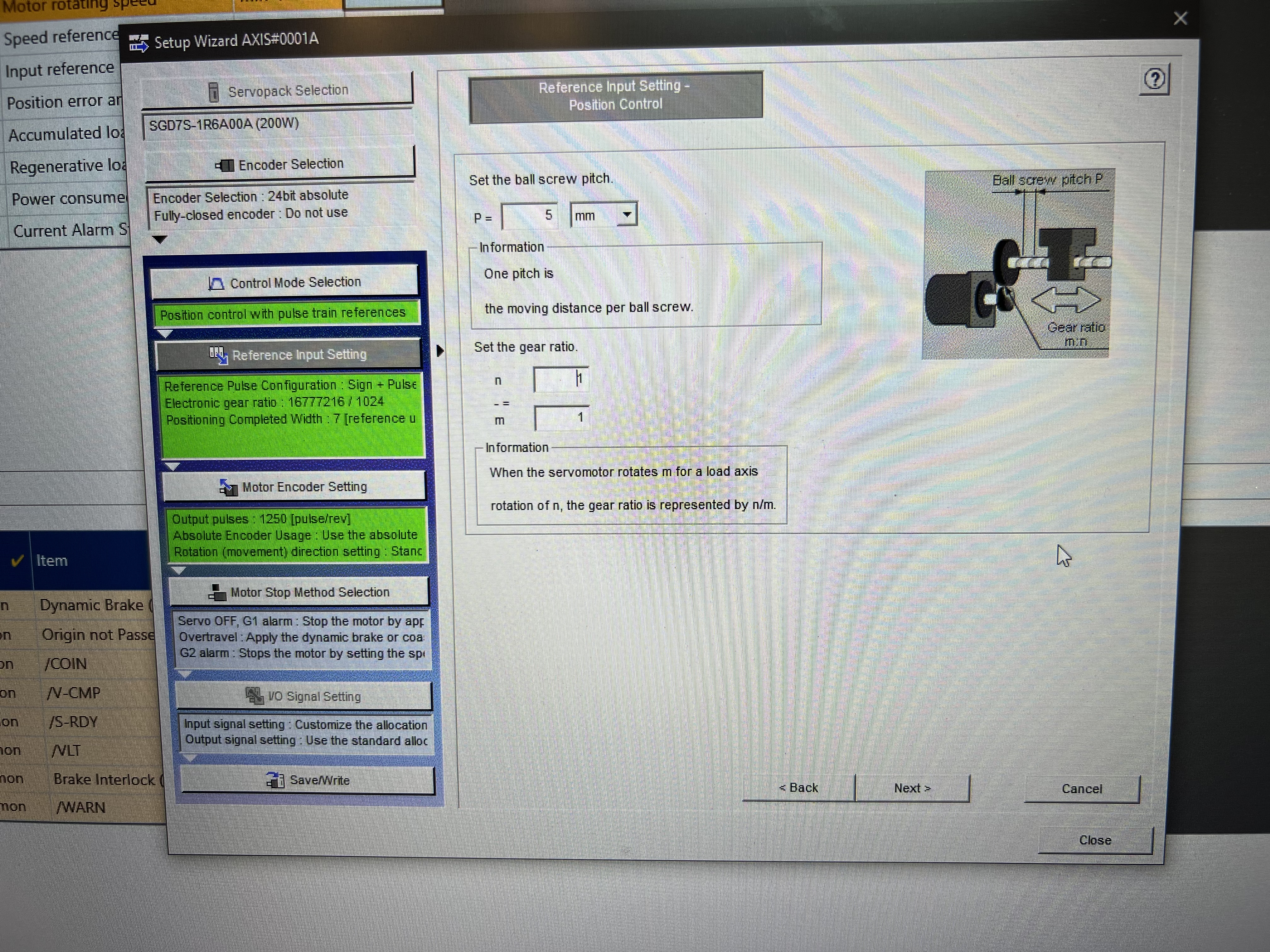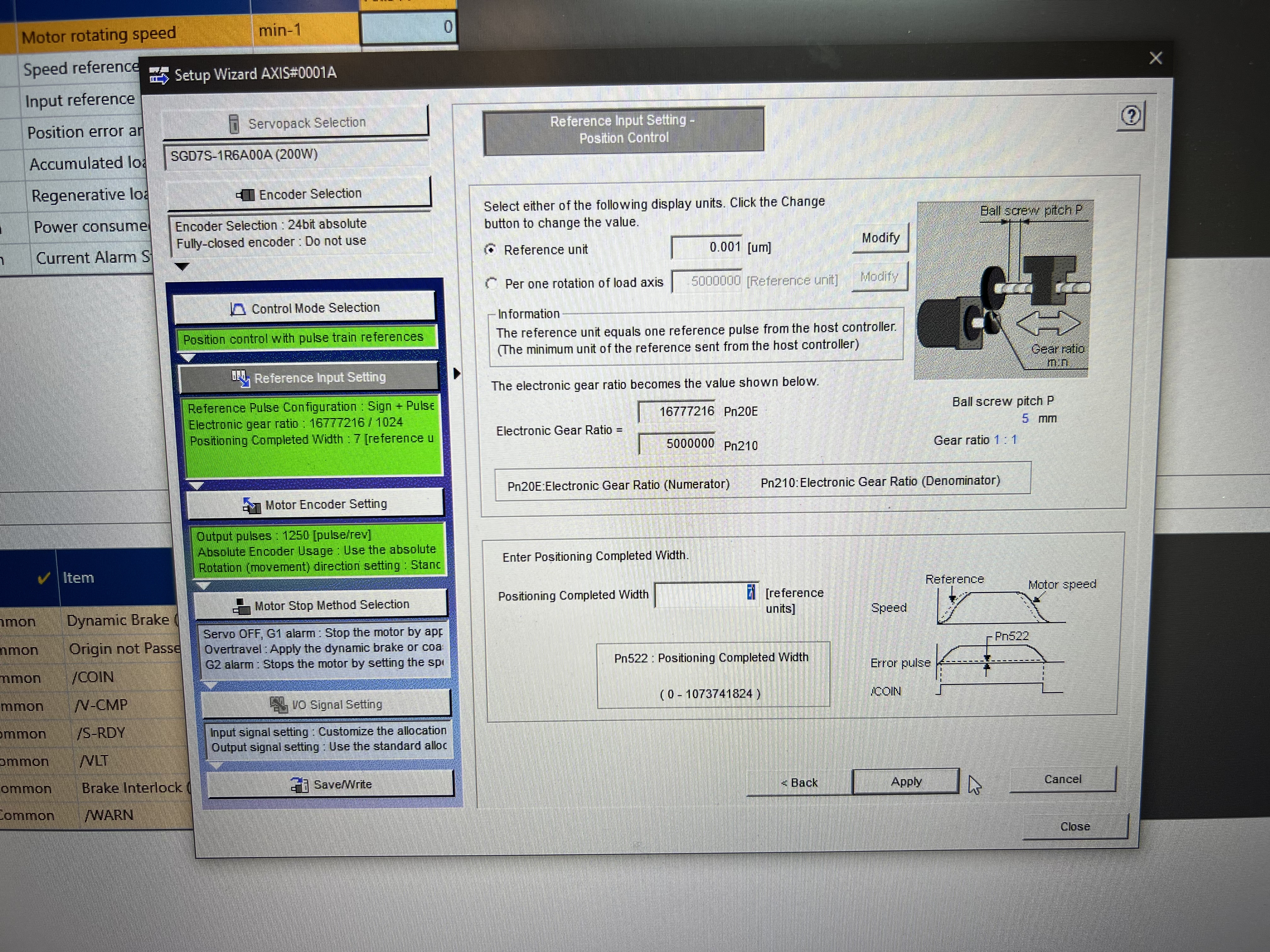 Начал бы с того, что просто сбросил данный сервопривод к заводским установкам. К примеру у серводрайверов Delta есть возможность менять электронную редукцию от внешних входов серводрайвера. Насколько понимаю, Yaskawa еще более крутой и нафаршированный сервопривод и там возможностей должно быть еще больше (как и возможностей запутаться). Заново настроил бы серводрайвер и записывал изменение каждого параметра.