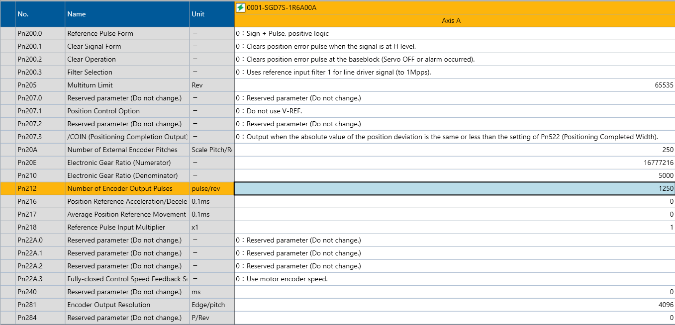 На фото параметр Pn212 - Encoder Divided Pulse Output When Using a Rotarysima8520 писал(а): Откуда я взял 62.5 спросите вы - я начал делить 1250 на 2, 4, 6, 8, 10 и так далее. В итоге 1250/20=62,5