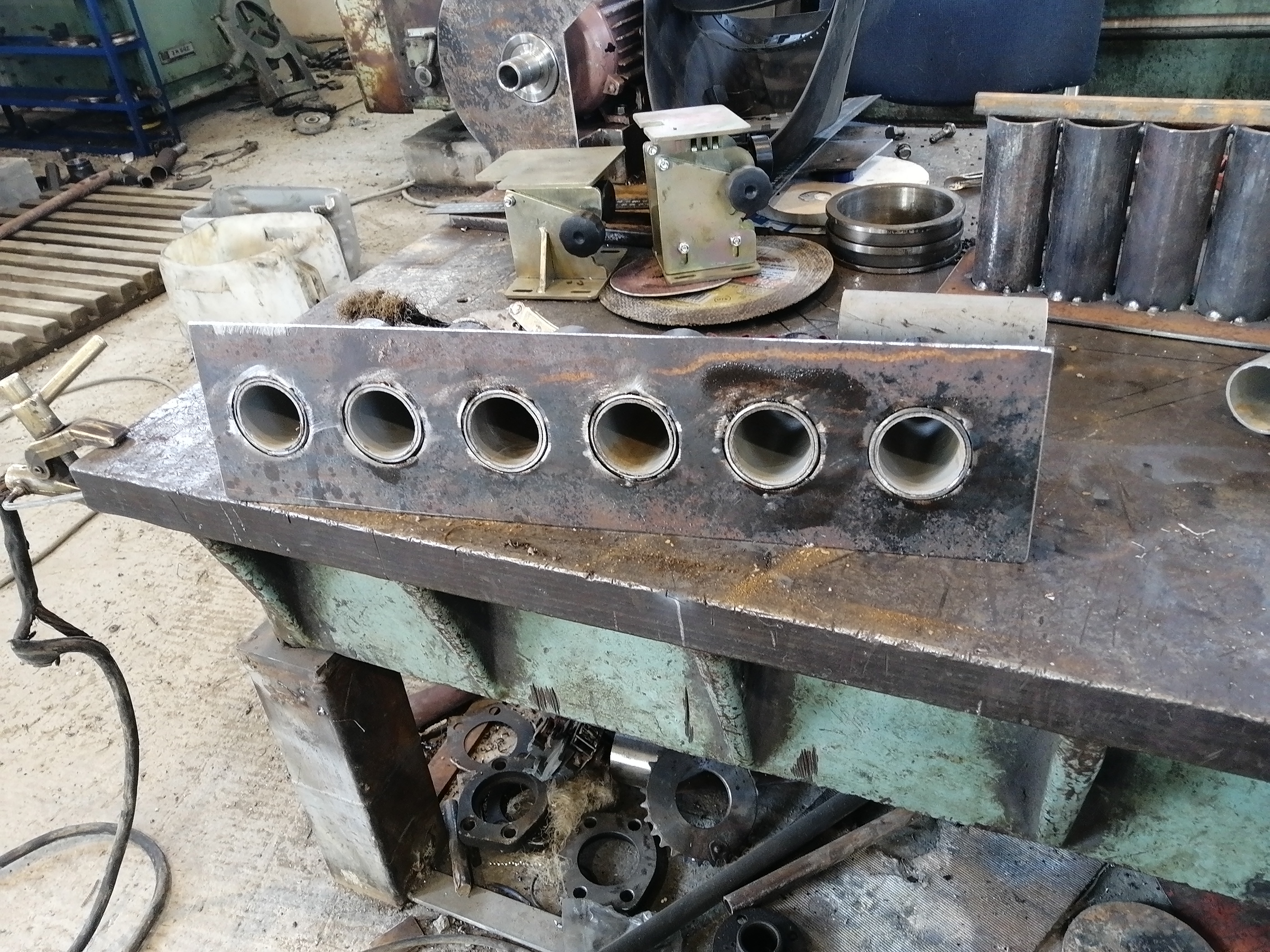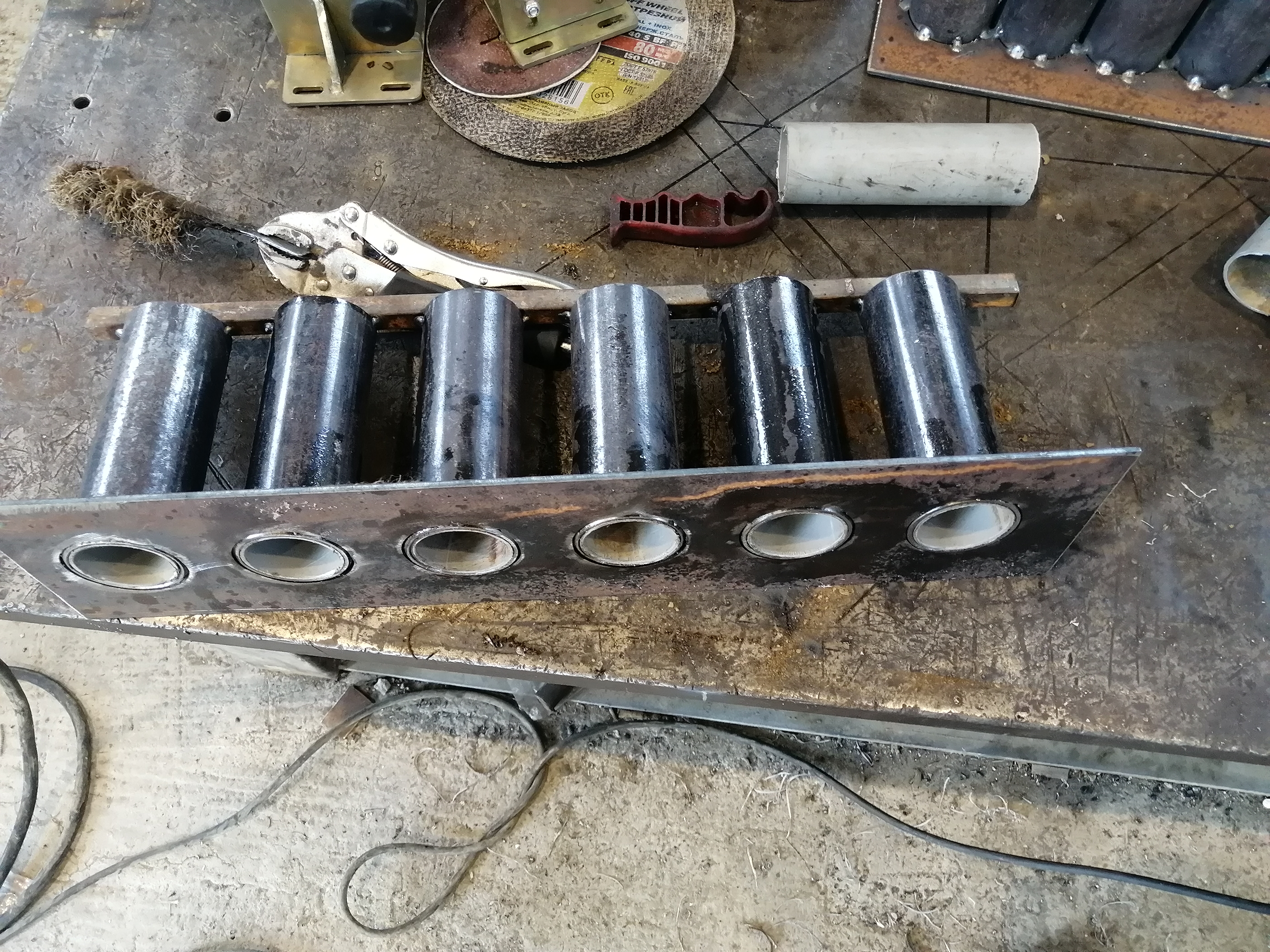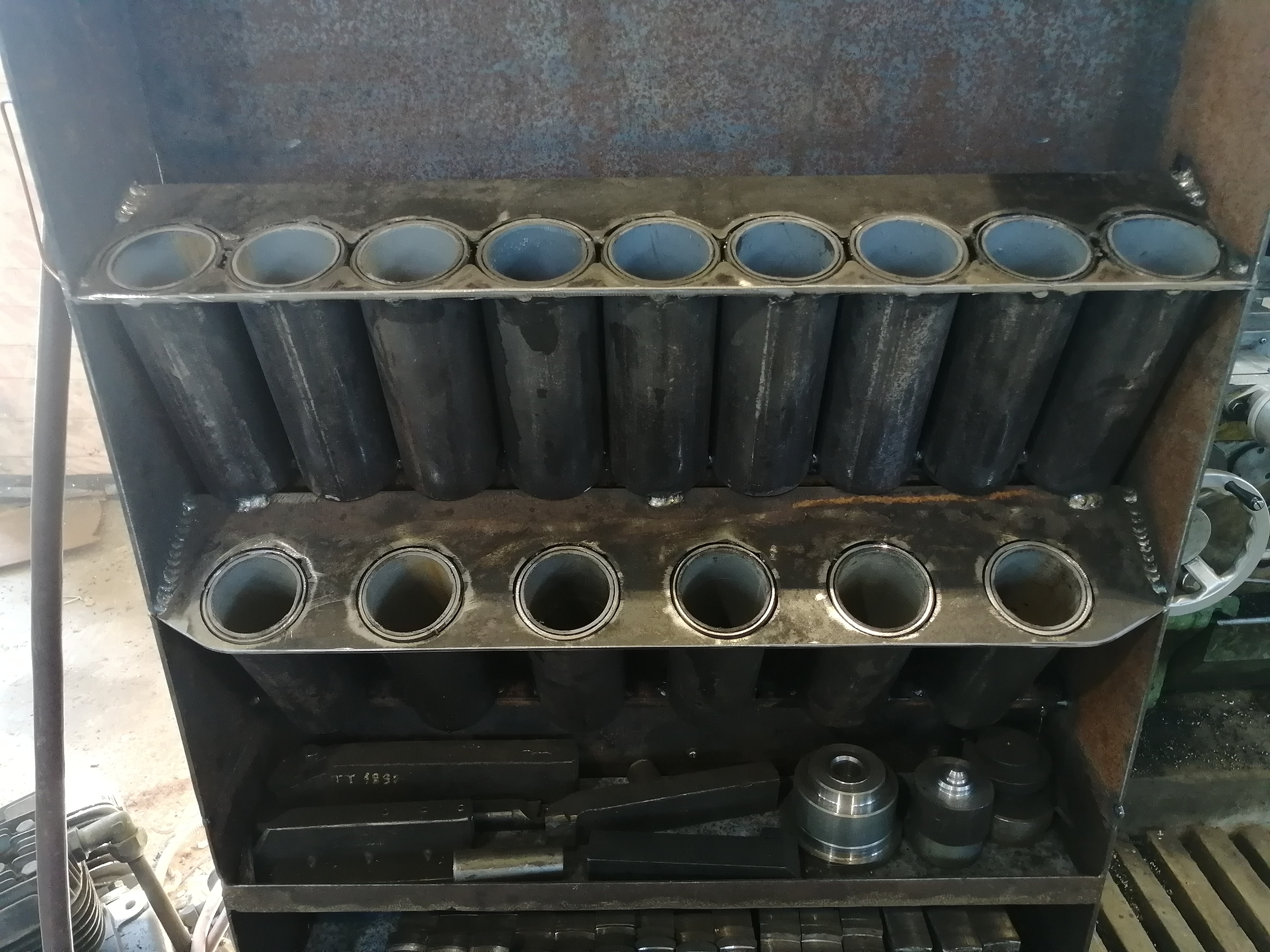 Были нарезаны трубочки Ф57 из стали в качестве корпуса и трубочки Ф50 из канашной пластиковой трубы в качестве защитного вкладыша, чтобы не царапать конусы. Ну и из этих заготовок были изготовлены чудесные держалки под КМ5. Тем кто будет повторять обращу внимание на то, что донца не заварены а специально приварена труба 16х16, чтобы всякий мусор свободно высыпался из стакана а конус провалиться не мог.