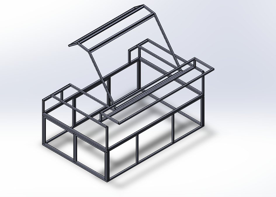 Если вдруг кто ещё читает) Каркас корпуса наконец-то собран. Конструкция выглядит прям монструозной. Конечно немного шатается, надо будет придумать какие-то рёбра жесткости. Но всё двигается и открывается без особых проблем. Дальнейший план: отделить отсеки с трубкой и электроникой от остального пространства с целью предотвращения попадания туда продуктов горения, установить газлифты для крышки, ну и обшивать всю конструкцию ПВХ листами