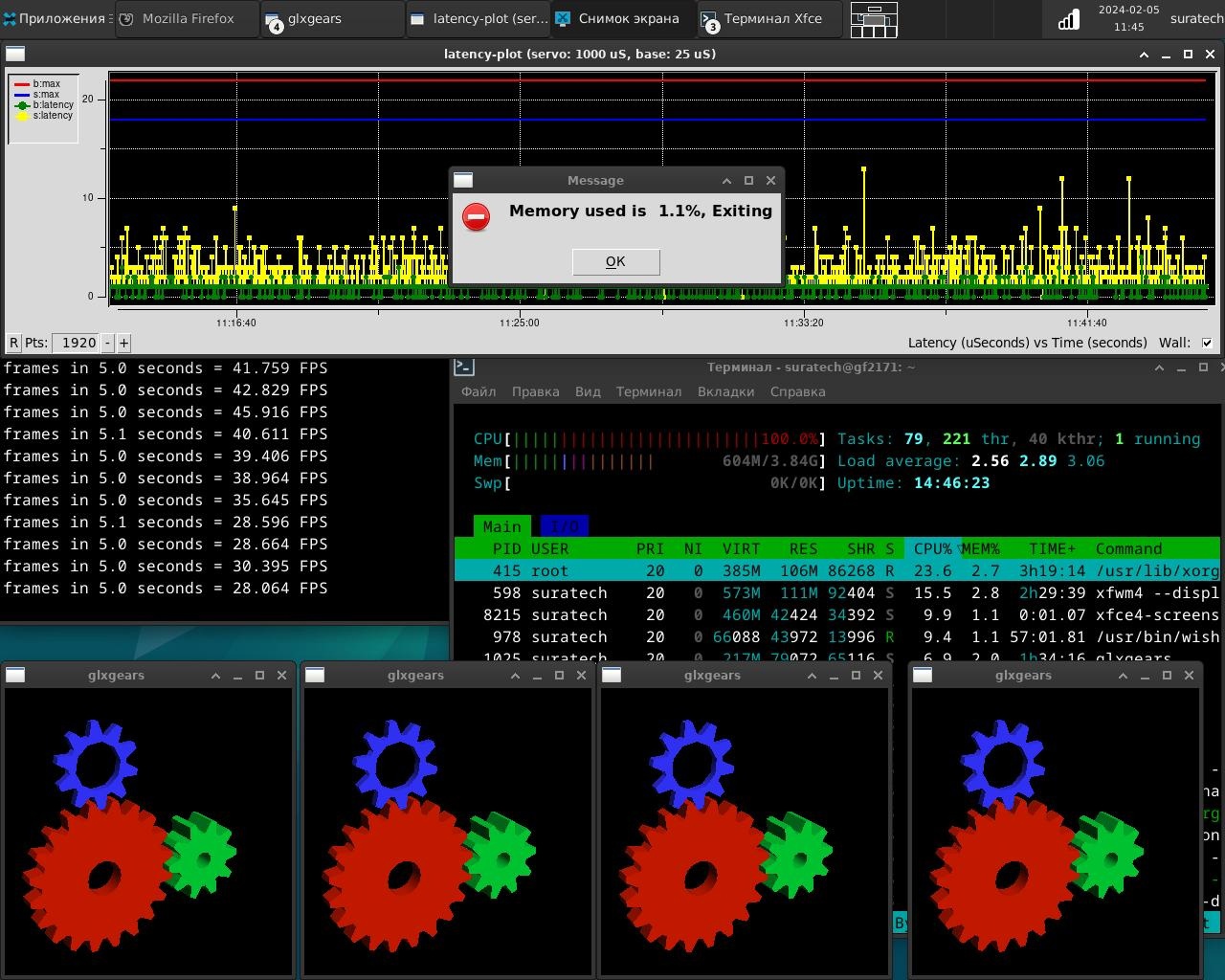 Ну и вот ещё "гирька" на весы в пользу новых ПК.. скрин с моего офисного ПК.. второй системой на винте 10ти летней старости стоит linuxcnc.. конфигурация и джиттер присутсвуют.. Отключил виртуализацию и изоляровал ядра 2,3. Интерфейс стал подтормаживать - видно по скачкам FPS. Но джиттер стабильный.