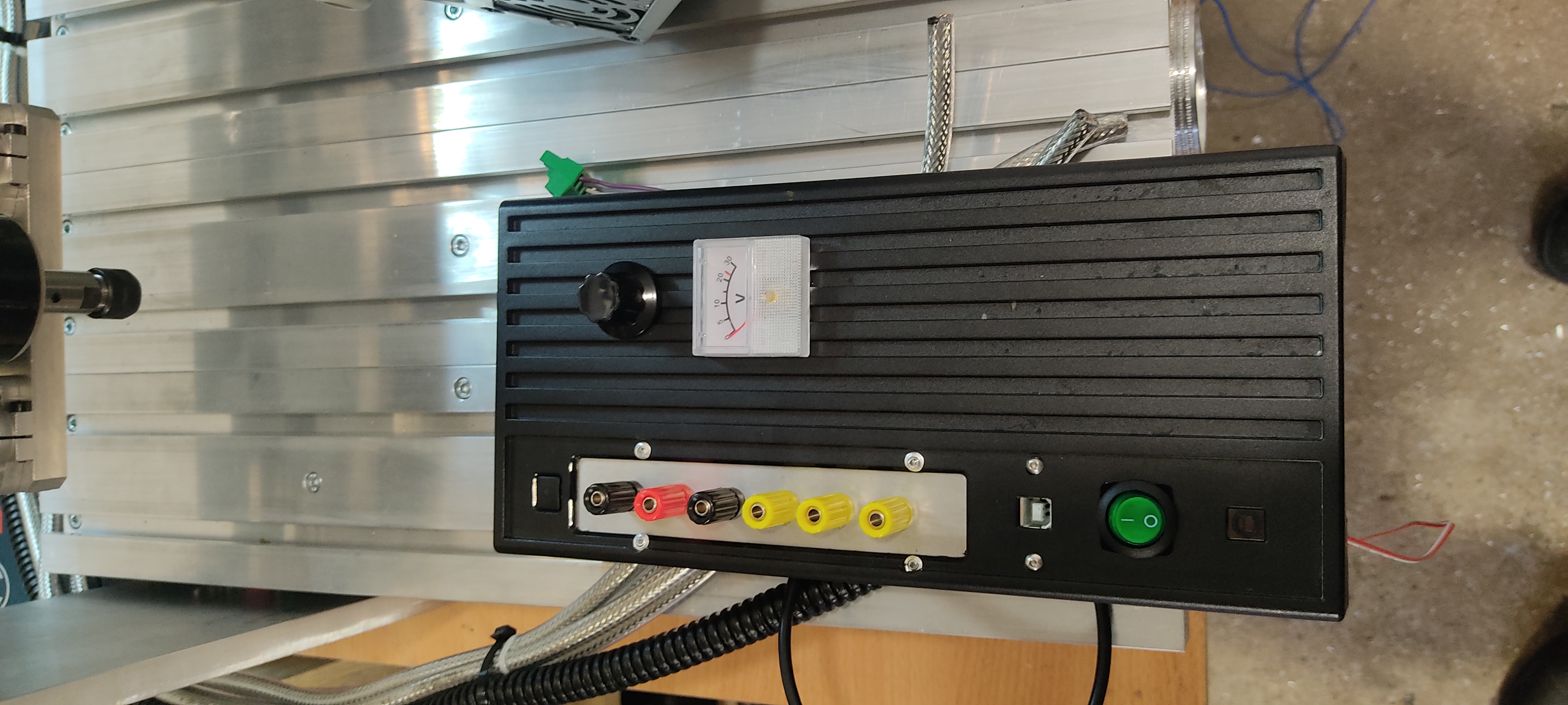 Вывел со станка все провода: 3*шд, шпиндель, 3*концевик, зонд и кнопка стоп. На переднюю панель вывел: клеммы напряжения 24, 12, 5, 3В, регулятор оборотов шпинделя, вольтметр 24В, кнопка включения блока питания 12в и его индикатор работы.