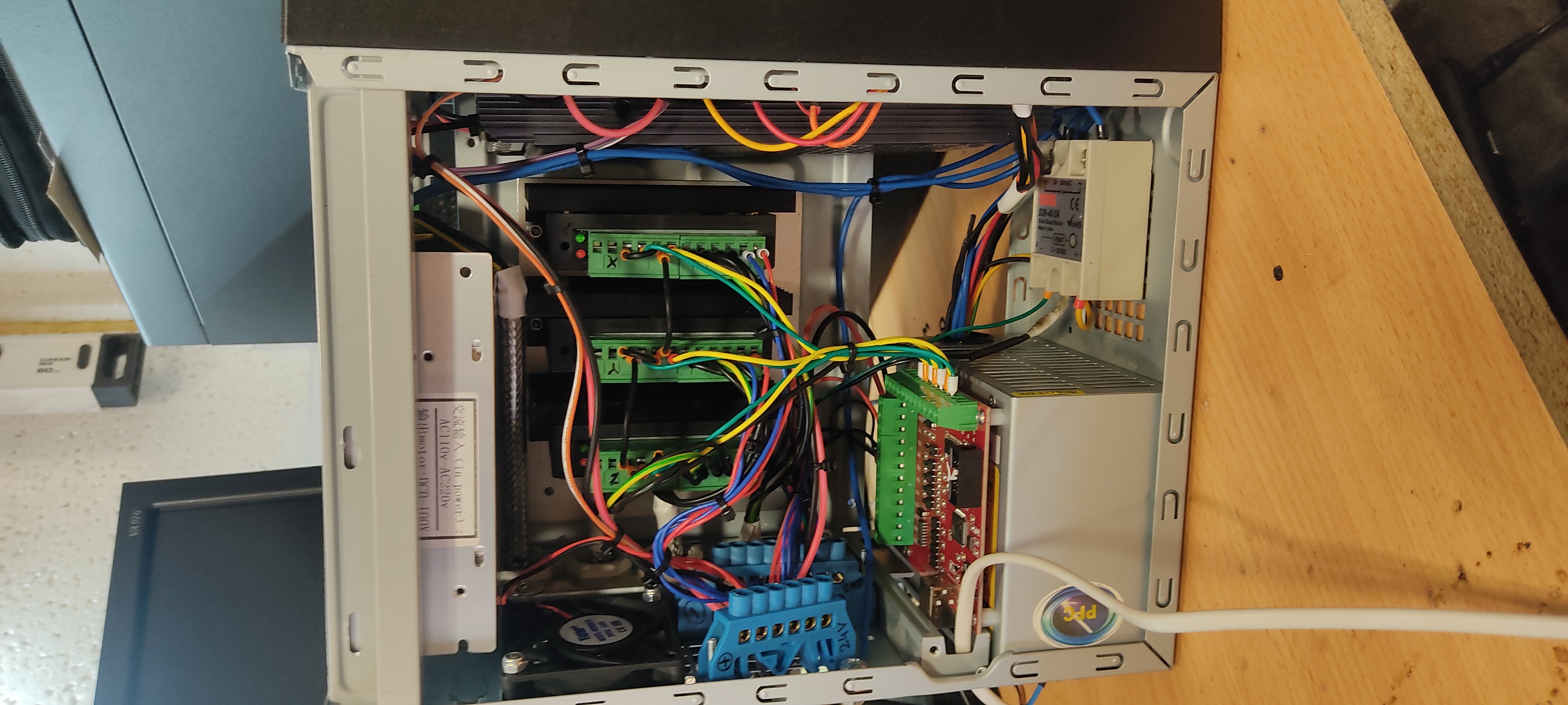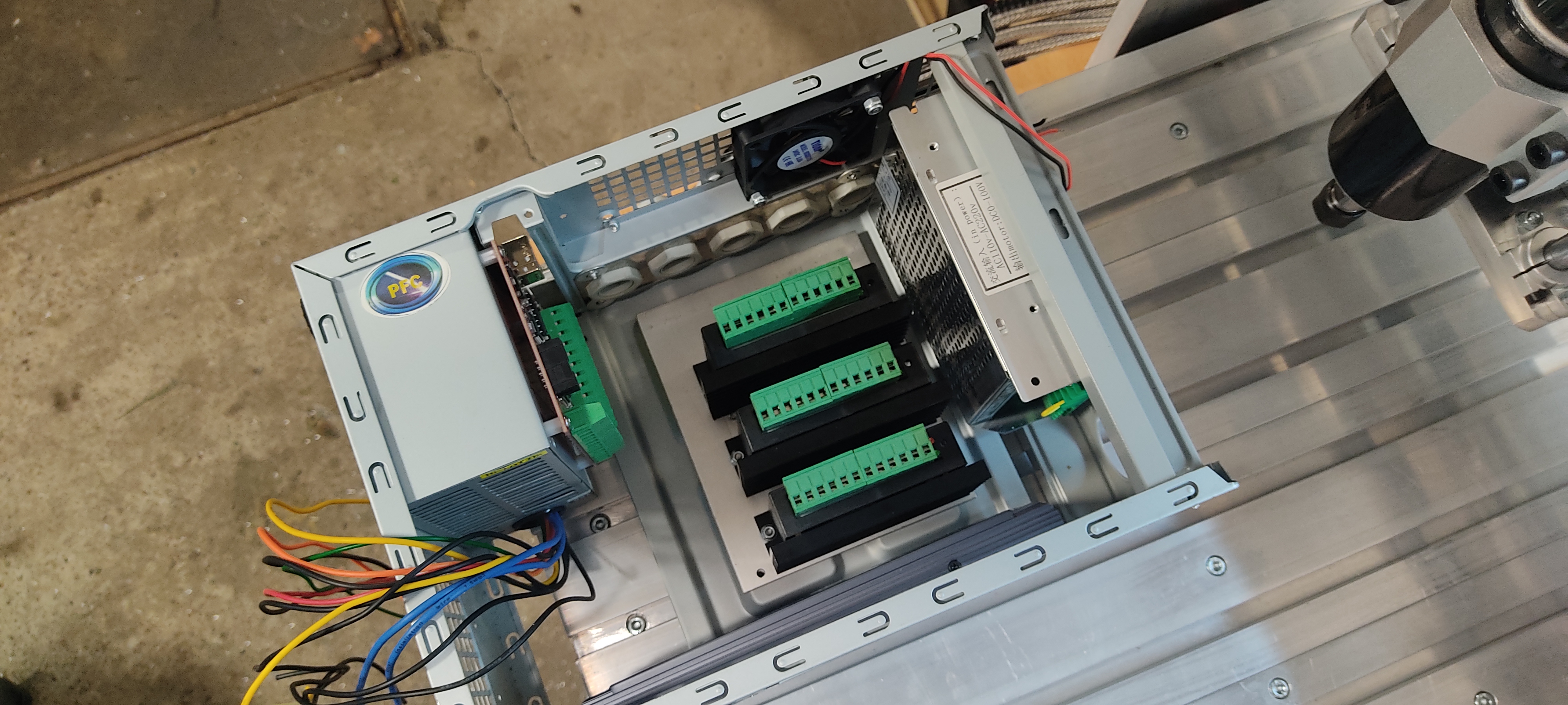 Все таки тесновато оказалось внутри)) два бп, три драйвера, бп для шпинделя, реле, плата, вентилятор и две колодки комутации питания на 24В. Кое как распихал...