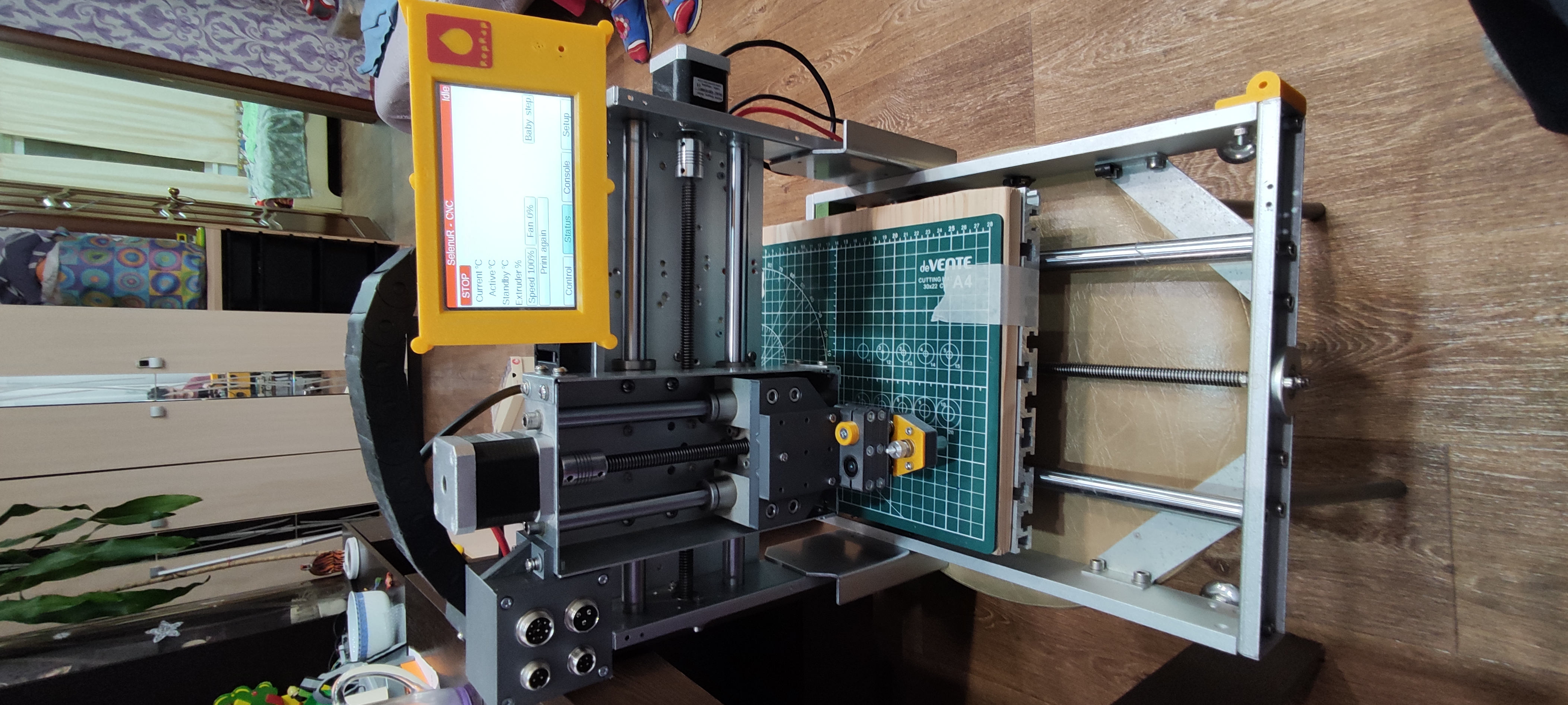 Вот мой "принтер" на мозгах от 3Д принтера на Мега2560, прошивка Марлин. Работает только три оси. Сейчас ему ещё и Вайфай прицепил, на ESP8266, чтобы файлы закидывать. Хотел ещё приделать кнопки перемещения по осям, но как- то уже пропал интерес.