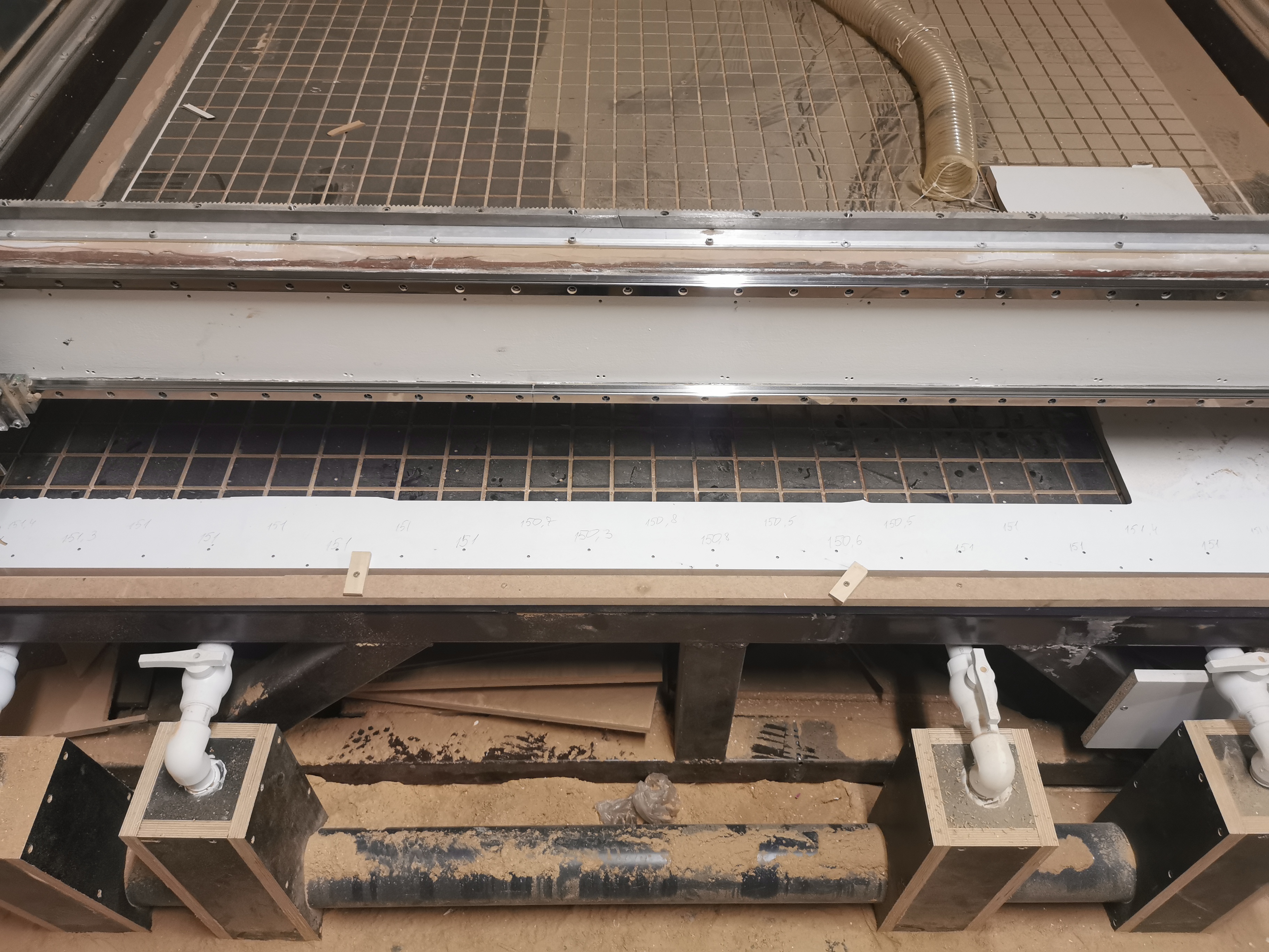 Итак, решил каждые 155 мм сделать засверливание. Фреза 4 мм, соответственно расстояние между отверстиями должно быль 151 мм. А в результате: 151-151,3-151-151-151-150,3-150,8-150,6-151-151-151.