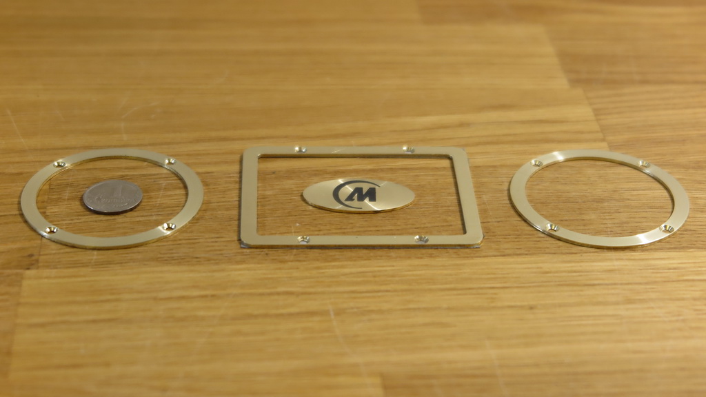 Латунь нашлась даже тоньше - 1мм. Городить огород со скотчем и суперклеем не пришлось, т.к. у деталей есть отверстия, которые можно было использовать для её крепления на станке. Станок грызет латунь удовлетворительно, хоть и тонкими слоями.