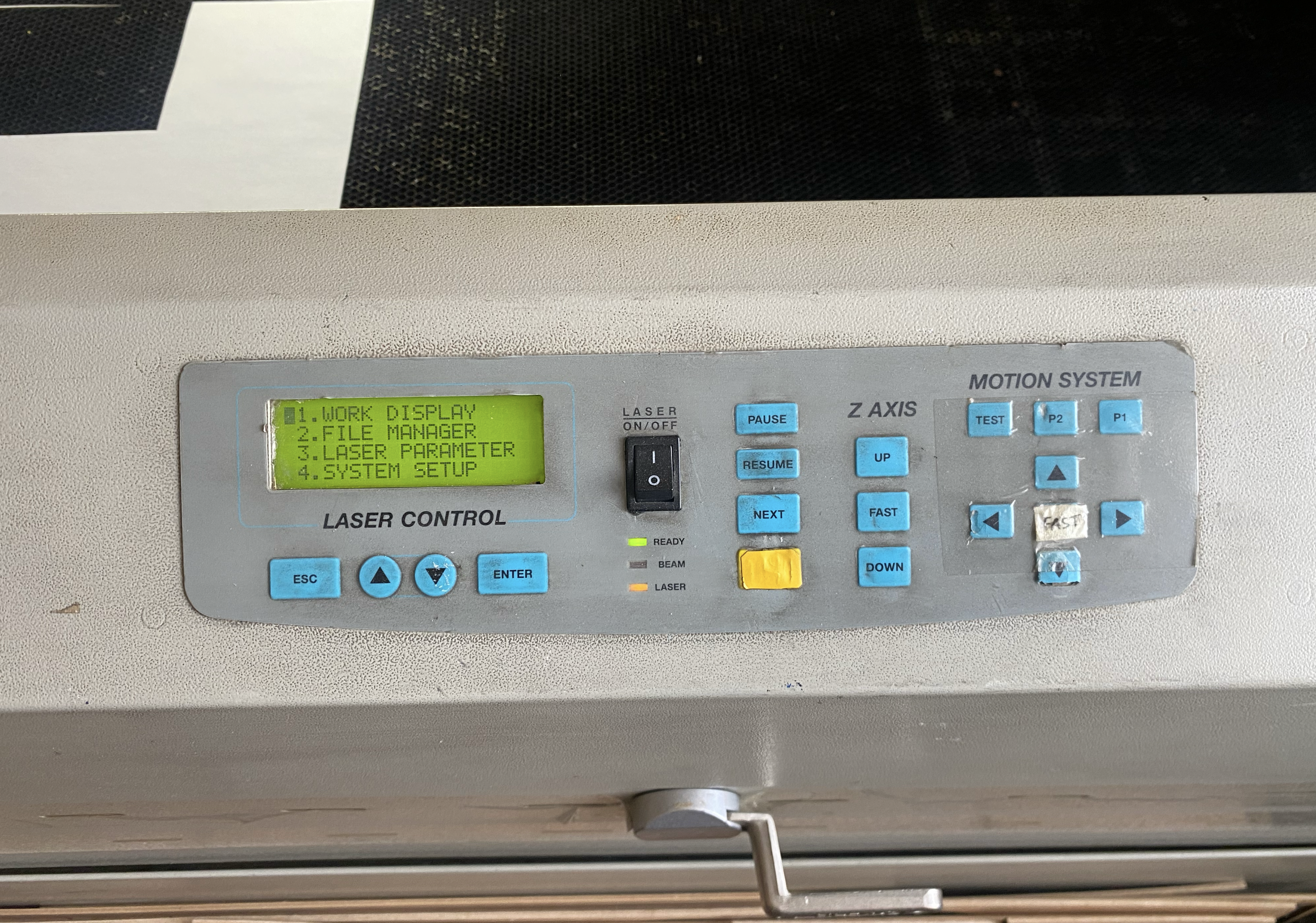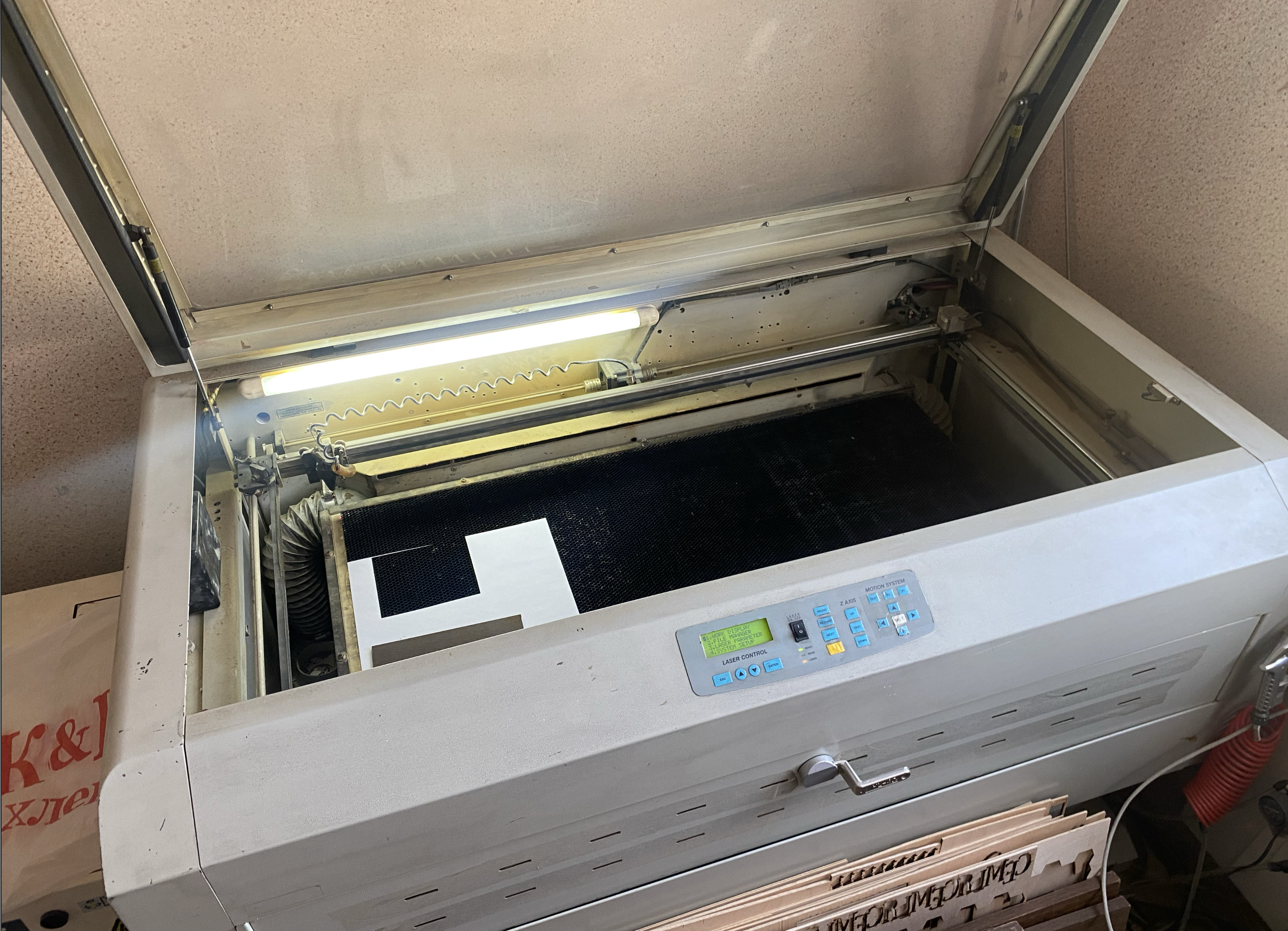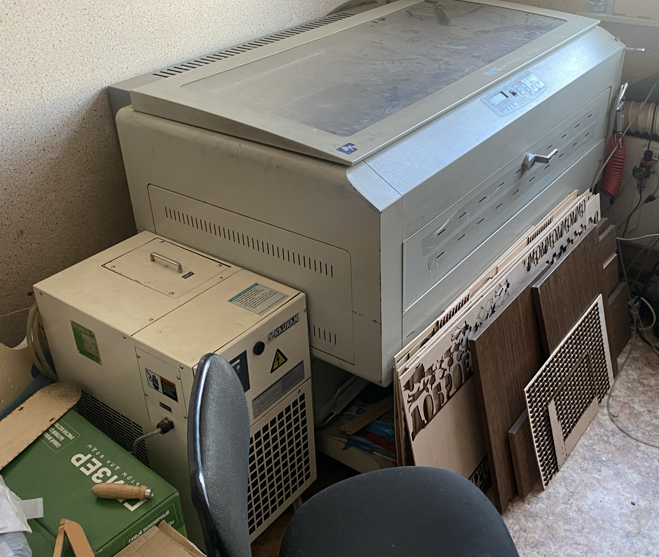 Фото, видео, документация, прочие материалы: Труба Synrad 50w c водяным охлаждением и ресурсом 50 000 часов из которых станок отработал суммарно около 8 000 часов за все время жизни. По одной оси стоит шаговый двигатель, по второй сервопривод с энкодером. Имеется регулировка высоты стола в огромном диапазоне. Работает по LTP или по сети. Я использую по сети на windows xp.