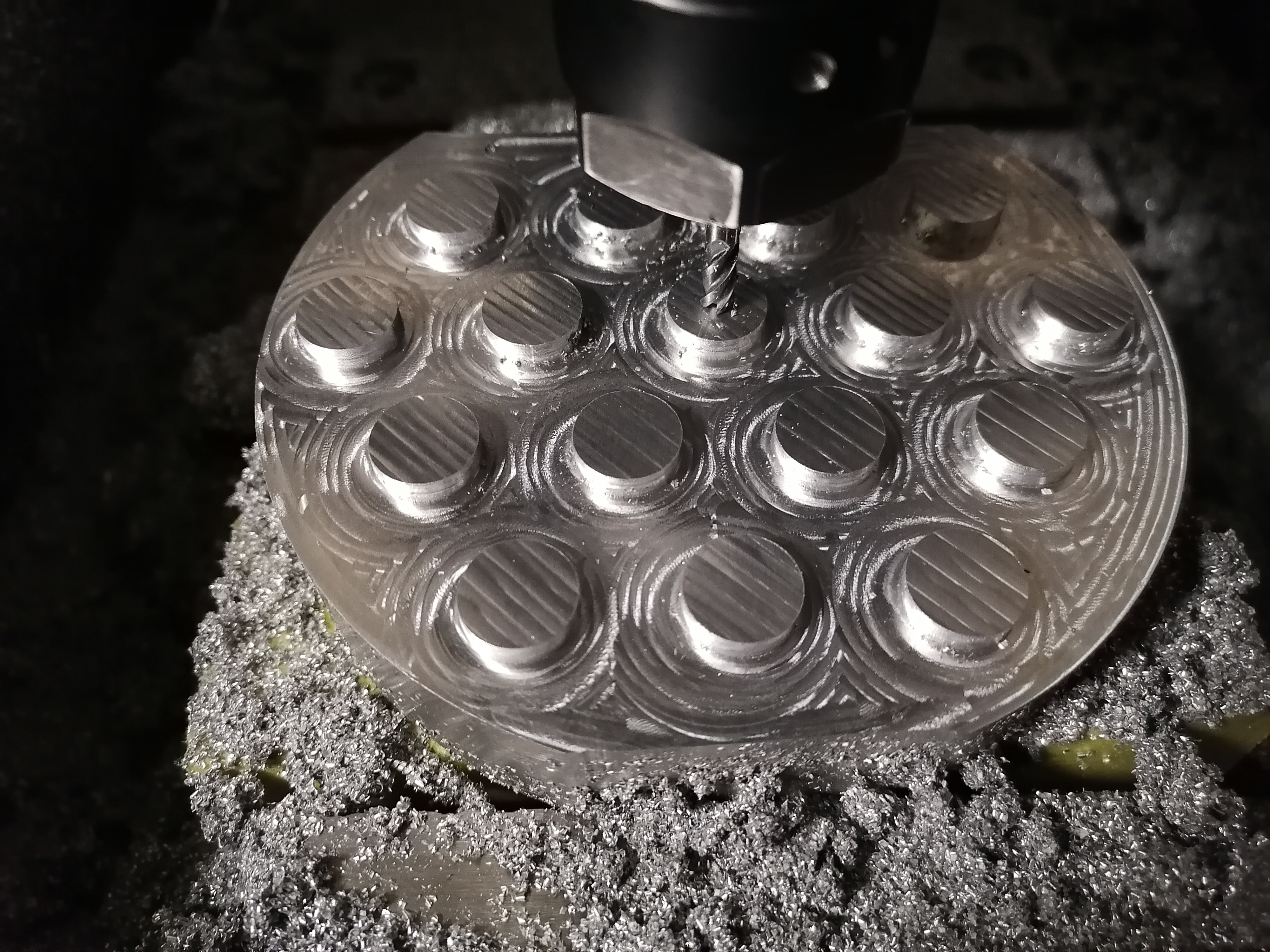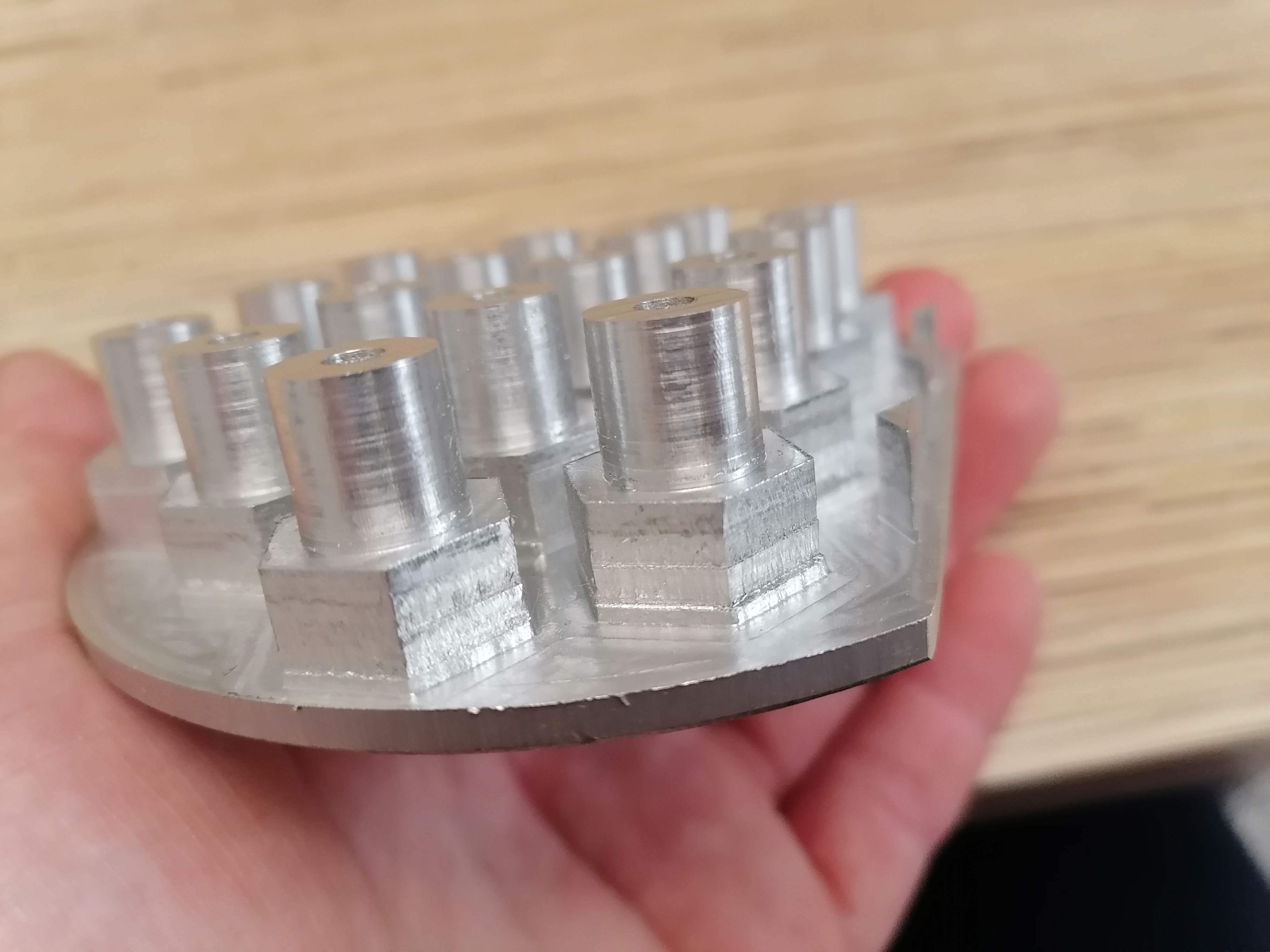 4. Я думал что на круглом куске алюминия если добавить как можно больше деталей то тем меньше нужно будет снимать стружки а значит и время сократится, но всё оказалось не так :thinking: будем считать это как прибавка к опыту. От этого и получается что между шестигранниками расстояние 5 мм.