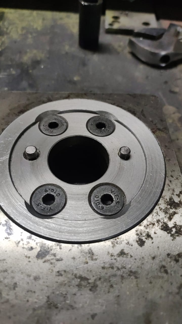 высоты блина не хватает, чтоб цековкой углубиться под винты, нашел DIN-овские впотай под шестигранник. развернул отверстия под установочные штифты.