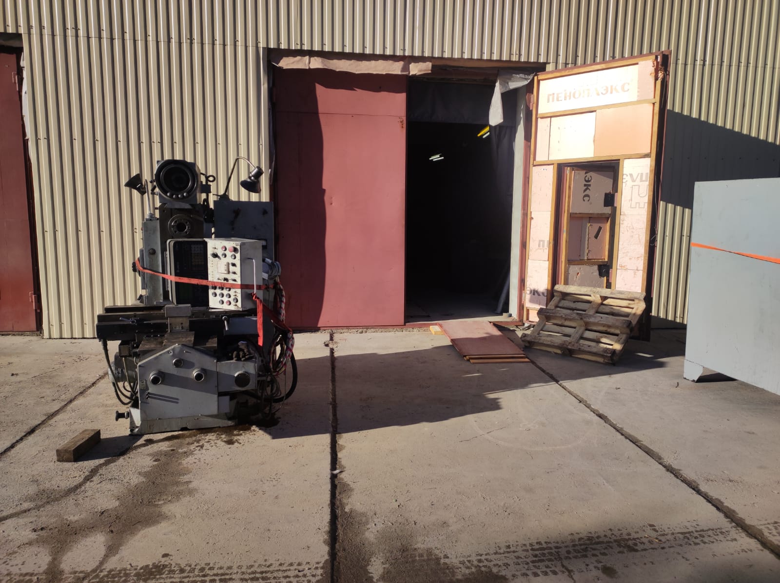 Расконсервировал по этому поводу средства малой механизации, лебедку и кран на пневмоходу. Сварщик Иван сделал из подручного швеллера и трубы санки, нарезали поката из трубы. Краном вывесили станок перед воротами, лебедкой взяли его на оттяжку, и вот станок центром массы уже внутри. Дальше подкладывая трубы и корректируя траекторию ломиусом притащили станок на место постоянной дислокации. Осталось придумать, как его с санок снять и установить на опоры. пока в голову приходит только городить козловой кран и применять 5-тонную таль.