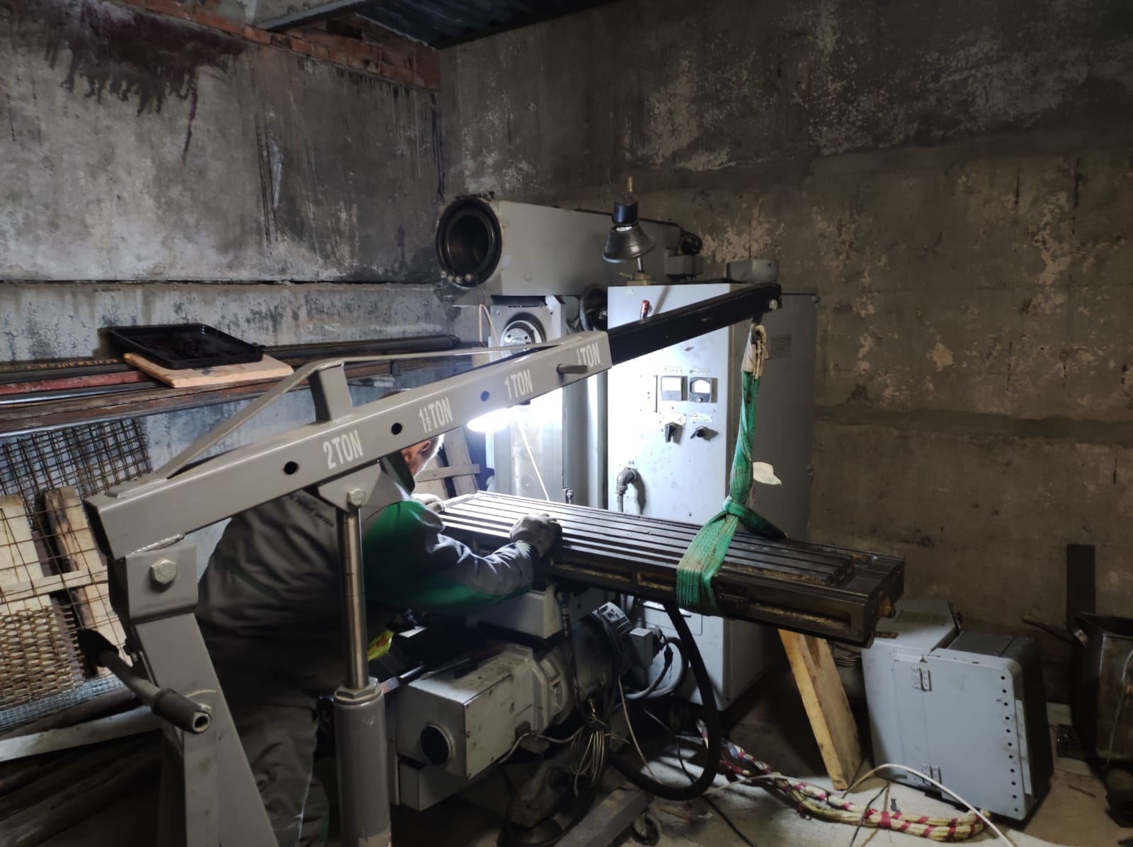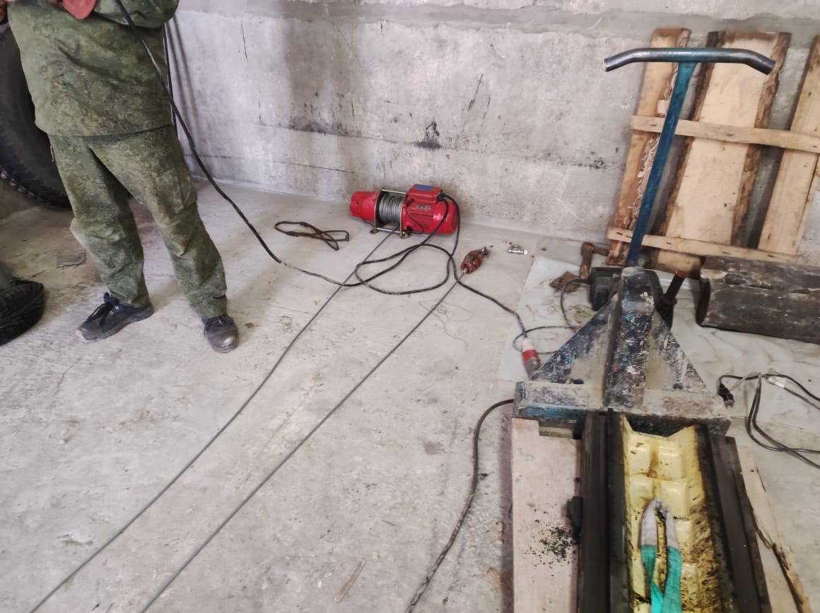 Расконсервировал по этому поводу средства малой механизации, лебедку и кран на пневмоходу. Сварщик Иван сделал из подручного швеллера и трубы санки, нарезали поката из трубы. Краном вывесили станок перед воротами, лебедкой взяли его на оттяжку, и вот станок центром массы уже внутри. Дальше подкладывая трубы и корректируя траекторию ломиусом притащили станок на место постоянной дислокации. Осталось придумать, как его с санок снять и установить на опоры. пока в голову приходит только городить козловой кран и применять 5-тонную таль.