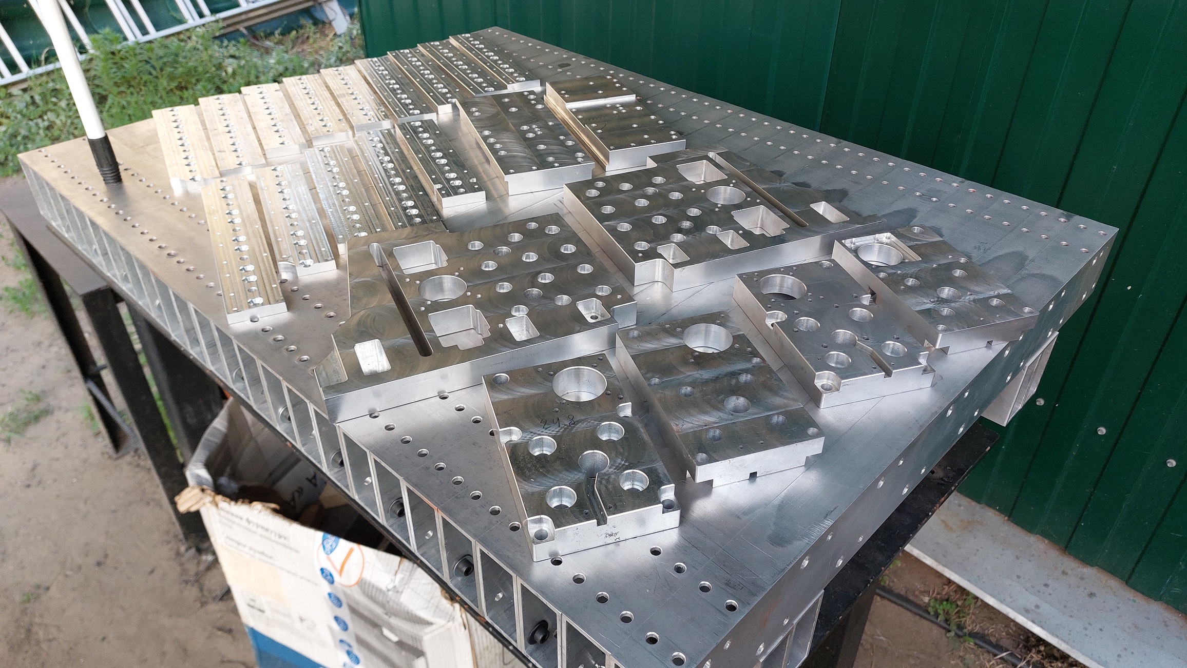 2. Мне все равно требуется обработать всю поверхность основной столешницы, чтобы сверху накинуть плиты, да и в местах где будут ставиться верхние балки тоже надо пройтись фрезером по всей поверхности установки балок, так как плиты все равно будут иметь некоторую погрешность по высоте (станок где их будут делать не очень точный), поэтому планируется сделать временную обвязку из стальной трубы 80х80х4, как временной основы (выставляться все будет после попытки выровнять нужные поверхности под установку рельс через подкладки и возможно с заливкой эпоксидки для выравнивания поверхностей - не знаю какая труба попадется и смогу ли я все выровнять, это серьезная работа, но наличие подкладок для выравнивания в данном случае не критично, поскольку это лишь временная обвязка.