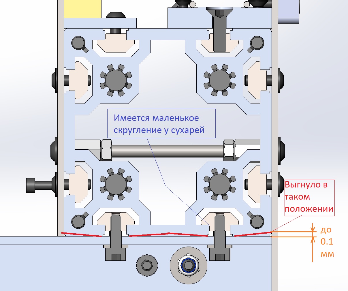 Видно, что прижатие пошло только по углам профиля 80х40 и в местах где сухари через Т-паз притягивают балку в станине.