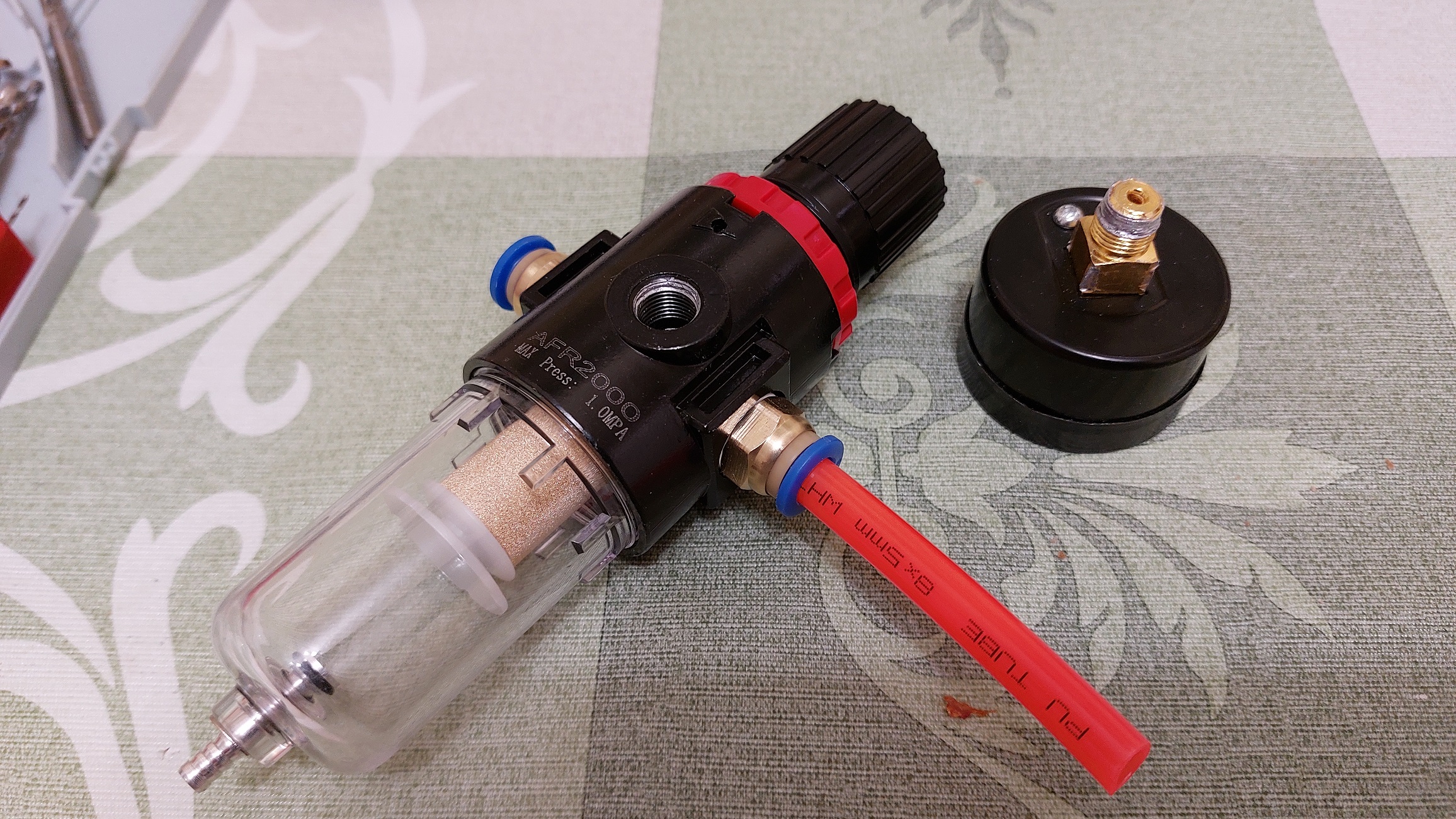 2. В этом фильтре (который я купил) клапан внизу нормально открытый, т.е. чтобы создать давление в фильтре, надо вручную оттянуть кончик клапана вниз, подождать пока давление не достигнет порядка 0,9 очка и после уже клапан удерживается сам в закрытом состоянии, когда давление падает ниже, он открывается автоматически - это не косяк производителя, это автоматический сброс конденсата, но я не думал когда заказывал что это работает так, в моем случае на ЧПУ такая система неудобна - проблема решается так, оттягивается кончик клапана, резинка внутри колбы затыкает окно для воздуха, после чего вставляется самодельная чека подобранной толщины, чтобы удерживать клапан в таком состоянии (если кто столкнеться по незнанию). Для ЧПУ не удачный момент в том плане, что давление в системе во время простоя может упасть ниже отметки 0,9, клапан фильтра сам откроется автоматически и воздух в систему подаваться перестанет, т.е. если станок работает без постоянного контроля, то при фрезеровке произойдет Ж....ПА, если конечно не заморочется аварийной остановкой по датчику давления в системе.