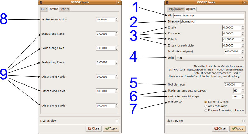 1.,2. Output Filename and directory. If output directory contains 'header' and/or 'footer' file they will be used as header and footer for resulting Gcode.