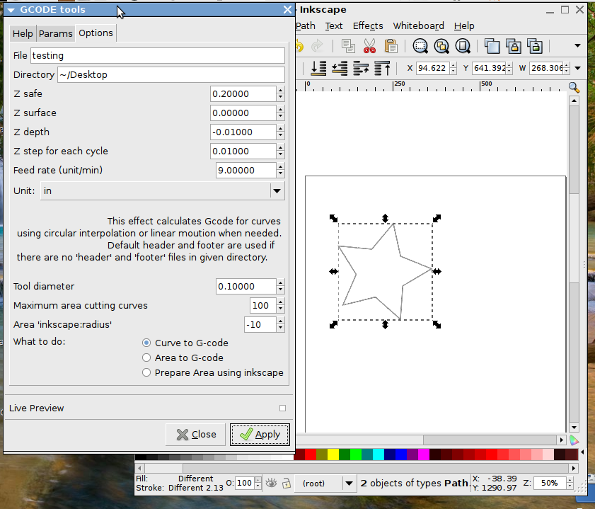 - Prepare Area using Inkscape - Creates a number of inkscape offset's which covers Path's area. This function can be applyed only to Inkscape Dynamic Offsets (Select path then Path -> Dynamyc Offset).