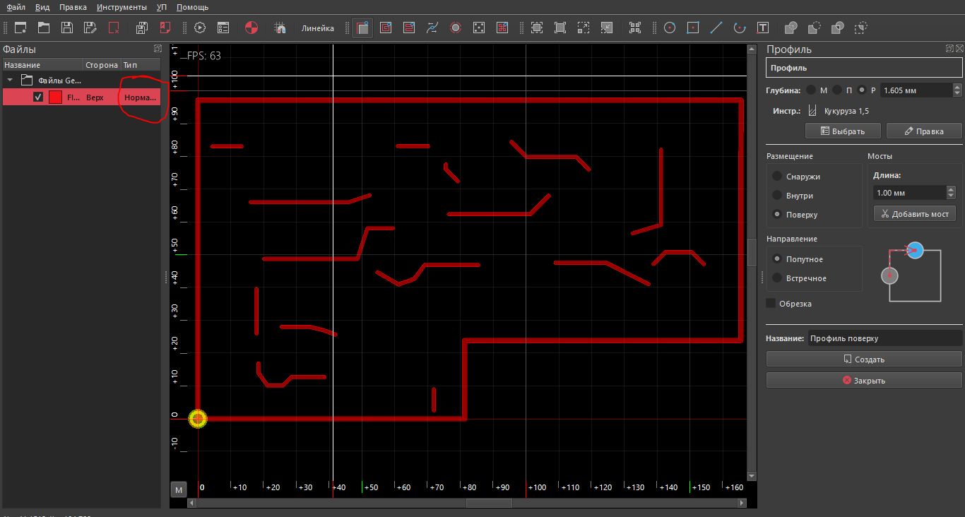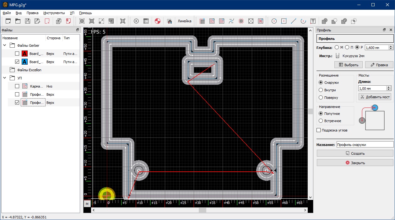 Второе. Если плата не прямоугольная и имеет прямоугольные вырезы по углам, программа генерирует фрезеровку в этих вырезах ЗА ПРЕДЕЛАМИ КОНТУРА ПЛАТЫ. Это же ненужная работа! И существенно увеличивает время фрезеровки, изнашивает инструмент.