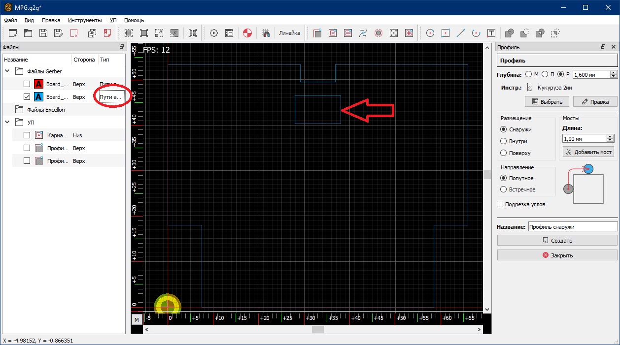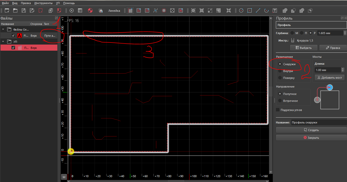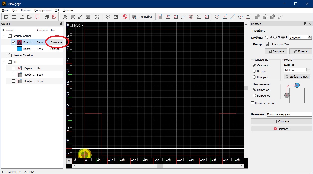 Версия платы №2, Выбрать всё => Профиль снаружи. Сгенерирована траектория с внутренней и с внешней стороны контура.