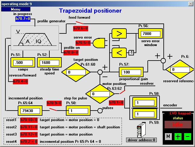 Имеется в работе привод Parker LVD10 в паре с серводвигателем с резольвером. С панели вводится длина отрезаемой ленты в мм по CAN в параметры 86:87 привода. Привод работает в режиме 9 - позиционирование.