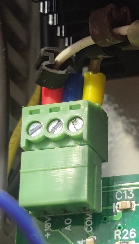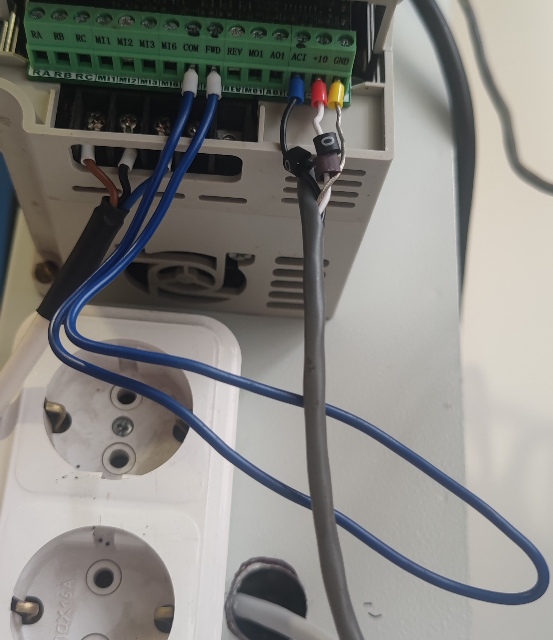 3. Настроить инвертор на управление оборотами с терминала (на колодку). Подключить на колодку переменный резистор 10кОм (ползунок на ACI), убедиться, что переменный резистор обороты регулирует. Контролировать тестером изменение напряжения между ACI и GND.