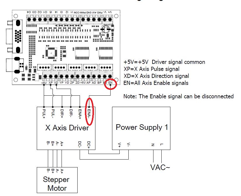 В программах Mach3, LinuxCNC и прочих NC_Planet, сигнал ENABLE подается на ШД станка с момента инициализации станка и снимается только по команде E-Stop. Это немного напрягает, т.к. ШД станка постоянно находятся под напряжением. Но это оправдано тем, что после установки домашней позиции, положение исполнительного механизма известно контроллеру до каждого микрошага.