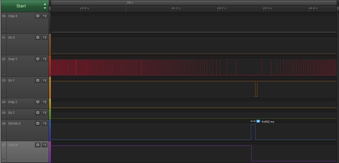Но добавились интересные артефакты - изменение сигнала Dir Y, когда фактически направление по этой оси не менялось и в период действия этого импульса никаких сигналов Step Y не поступает