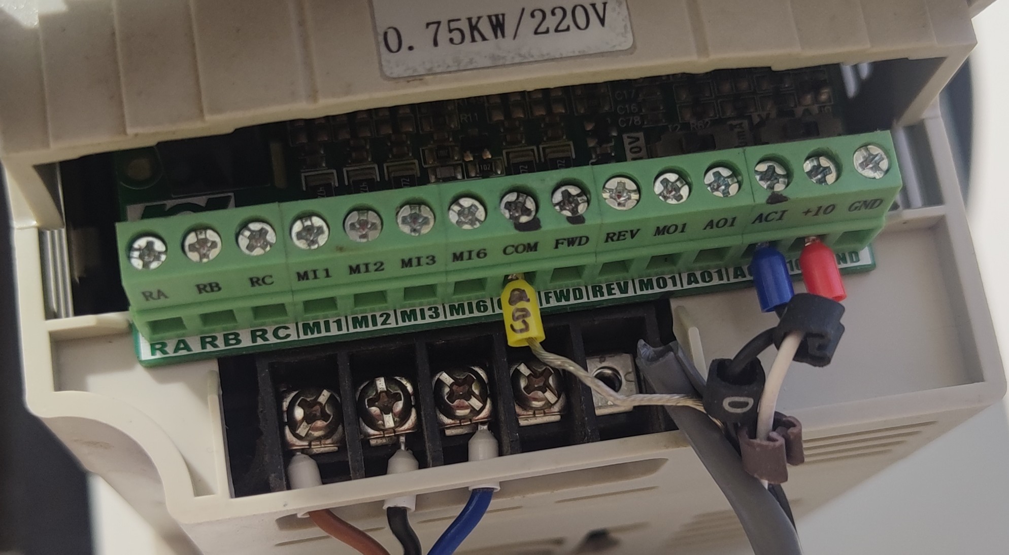 3. Настроить инвертор на управление оборотами с терминала (на колодку). Подключить на колодку переменный резистор 10кОм (ползунок на ACI), убедиться, что переменный резистор обороты регулирует. Контролировать тестером изменение напряжения между ACI и GND.