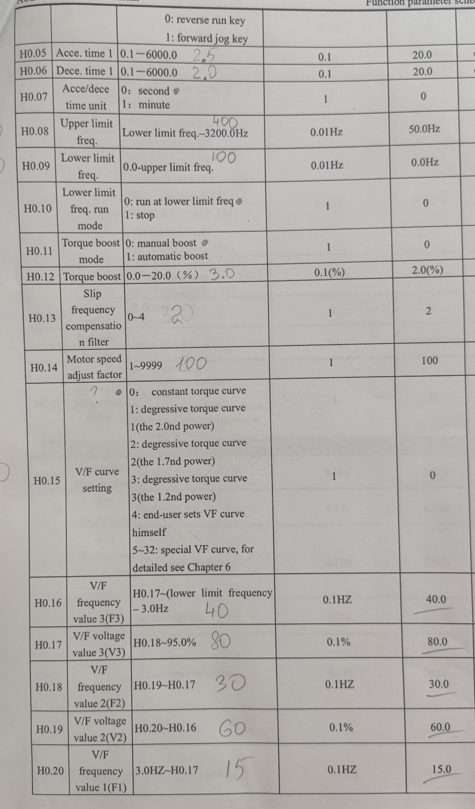 По результатам исследований настраивайте параметры частотника H1.05 -H1.08
