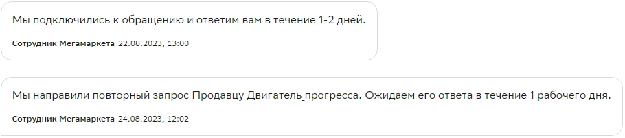 Т.е. "Мы - базарчик. Продали место продавцу, а вы с ним уж сами разбирайтесь". В моем случае Мегамаркет проявил себя совершенно безответственно! Когда я создал обращение о некачественном товаре, Мегамаркет выдавал мне чистые отписки "Мы направили Ваш запрос продавцу и ждем ответа...". Одно лишь было сообщение, похожее на ультиматум. Но и там гора родила мышь.