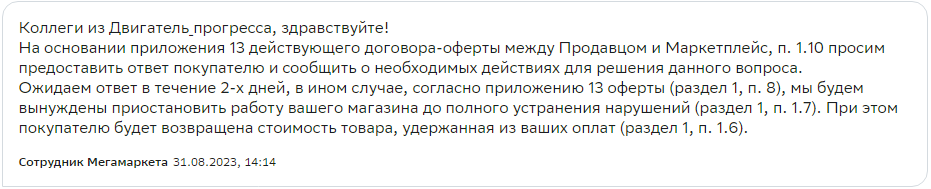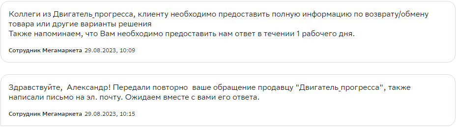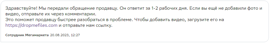Т.е. "Мы - базарчик. Продали место продавцу, а вы с ним уж сами разбирайтесь". В моем случае Мегамаркет проявил себя совершенно безответственно! Когда я создал обращение о некачественном товаре, Мегамаркет выдавал мне чистые отписки "Мы направили Ваш запрос продавцу и ждем ответа...". Одно лишь было сообщение, похожее на ультиматум. Но и там гора родила мышь.