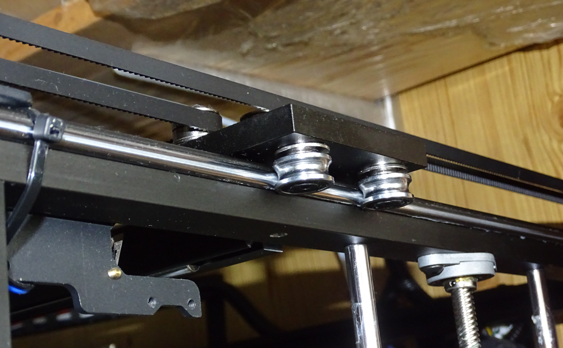 Не понял, какой опыт? У меня CoreXY на стальных рельсах и каждая каретка зажимает рельс четырьмя подшипниками с канавкой и регулируемым прижимом к рельсу. По оси Z в процессе печати только вертикальное перемещение на высоту слоя.