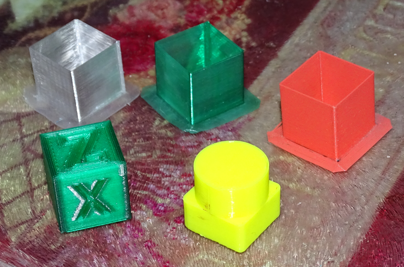 Образцы печати. Толщина стенки в пустотелых кубиках 0,4 мм. Желтый PLA, пришедший с принтером. Остальные - PETG.