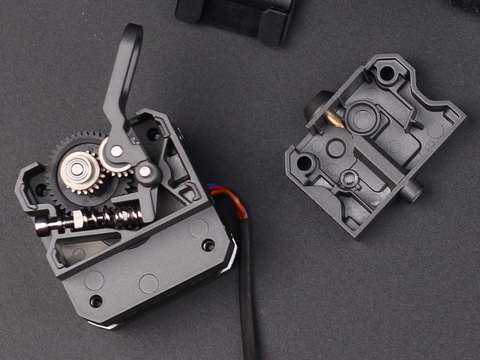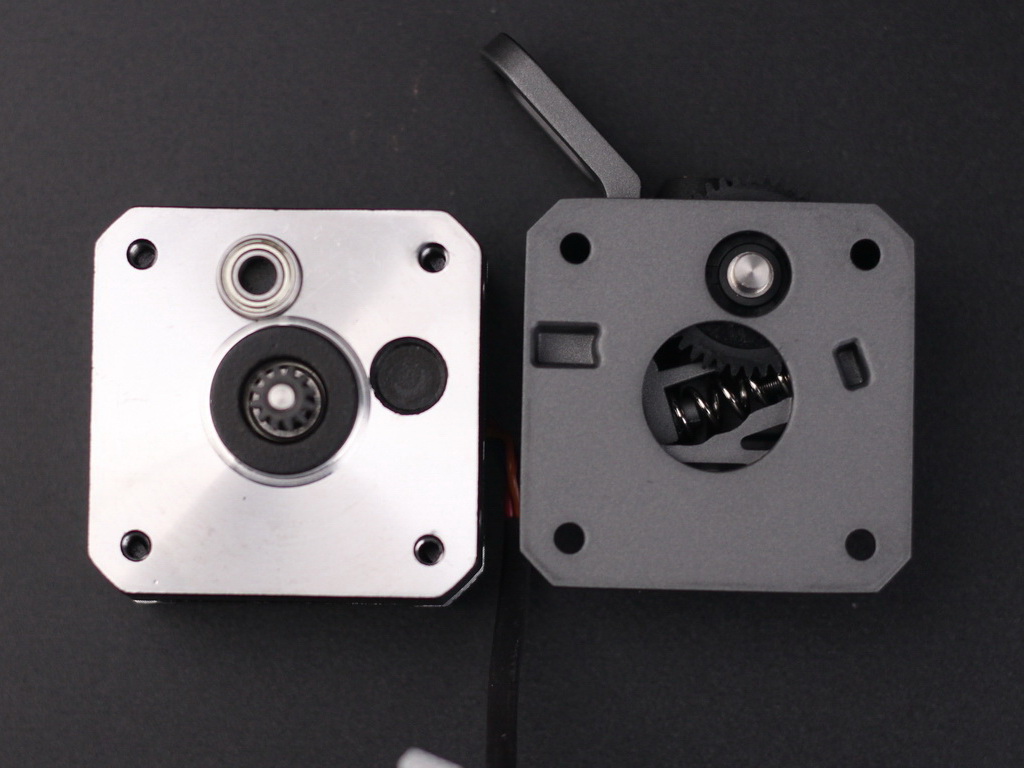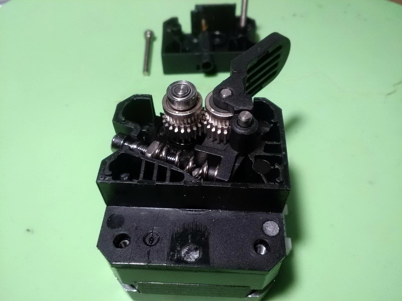 Литьё пластика - так себе. К тому же, две части пластикового корпуса скреплены всего на 2-х винтах в верхней части, хотя нагрузка от пружины немалая и приложена вовсе не рядом с этими винтами. Делать посадочные отверстия под подшипники в алюминиевом корпусе ШД - спорное решение. Заменить ШД будет не так-то просто в случае чего. К шестерням претензий нет: гладкие, без заусенцев, зубья протяжки острые. Однако во время экструзии при определенных режимах издает какой-то тихий рокот. На пропуск шагов не похоже, на проскальзывание прутка тоже. Не понял пока. Видимо надо настроить прижим роликов (только не знаю методики).