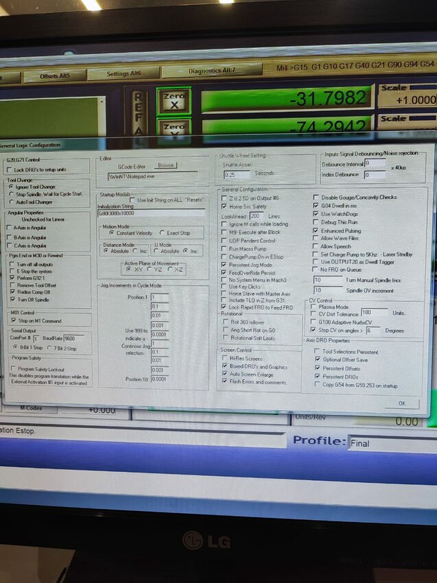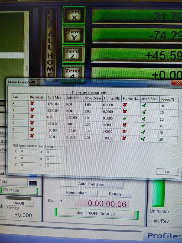 Всем доброго дня, такая проблема: Станок с двумя двигателями по оси Y. В Mach3 настроил ось A в подчиненном режиме к оси Y. Настроил так, чтобы оси Y и A калибровались независимо друг от друга по своим датчикам. Все работает нормально, пока в G-коде нет отрицательных значений оси Y. При отрицательных значениях ось Y работает правильно, но ось A останавливается на нуле. Например, имеется строчка y10, а следующая строчка y-10. Ось Y пройдет все расстояние в 20 мм, но ось A пройдет только 10 мм и остановится на Y0, что приведет к перекосу портала. При ручном перемещении проблемы нет, проблема возникает только при выполнении G-кода. Так же если выключить Soft Limits проблема исчезает. Подскажите пожалуйста в чем может быть дело? Основные настройки прикрепил, если нужно еще что то - скину. Буду очень благодарен за любые идеи.