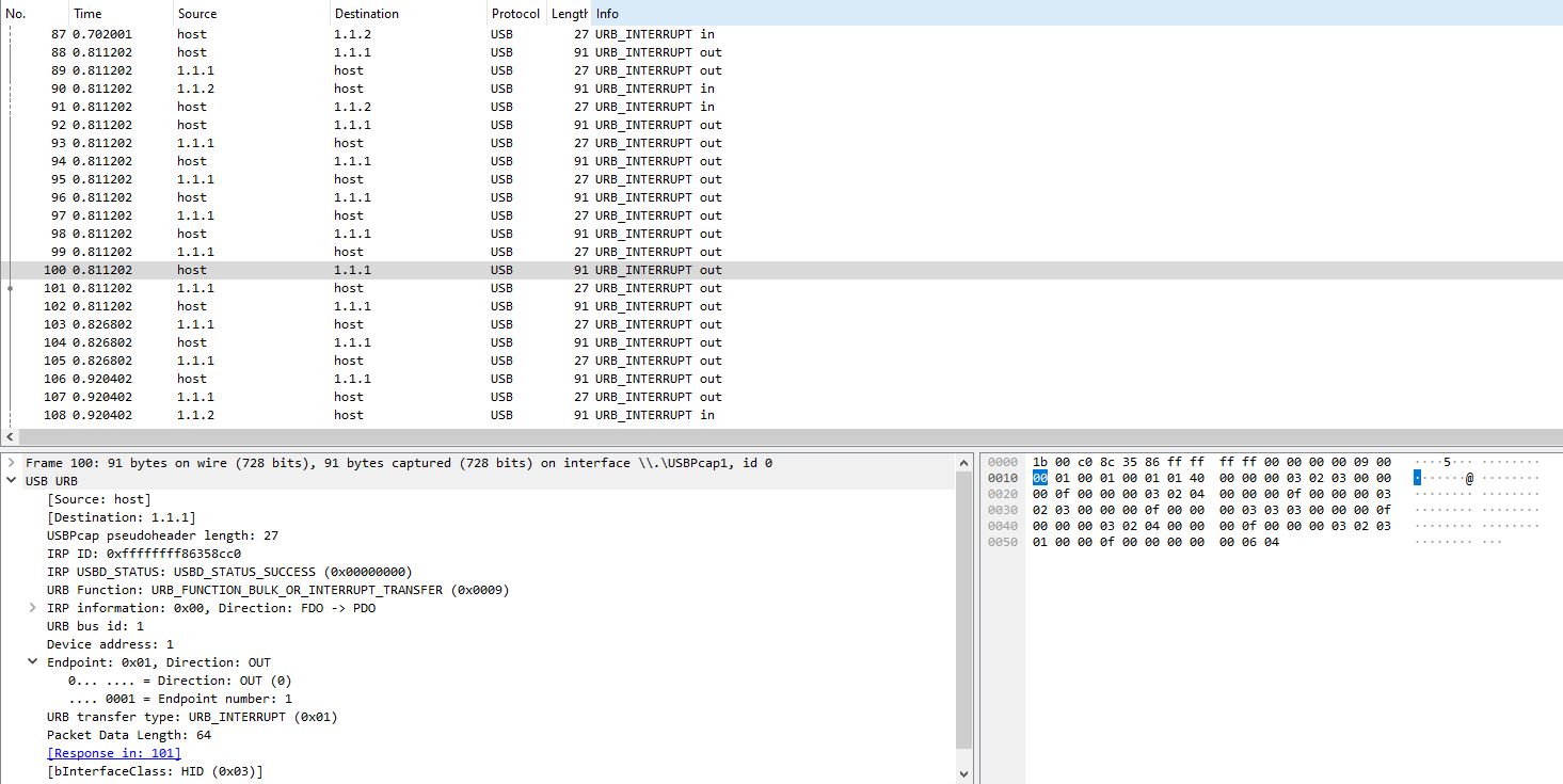 Обратите внимание на время пятнадцати фрэймов (с 88 по 102 строку) - timestamp все одинаковы. То ли USB передает их пакетом, то ли сниффер не может разобрать точный момент их отправки.