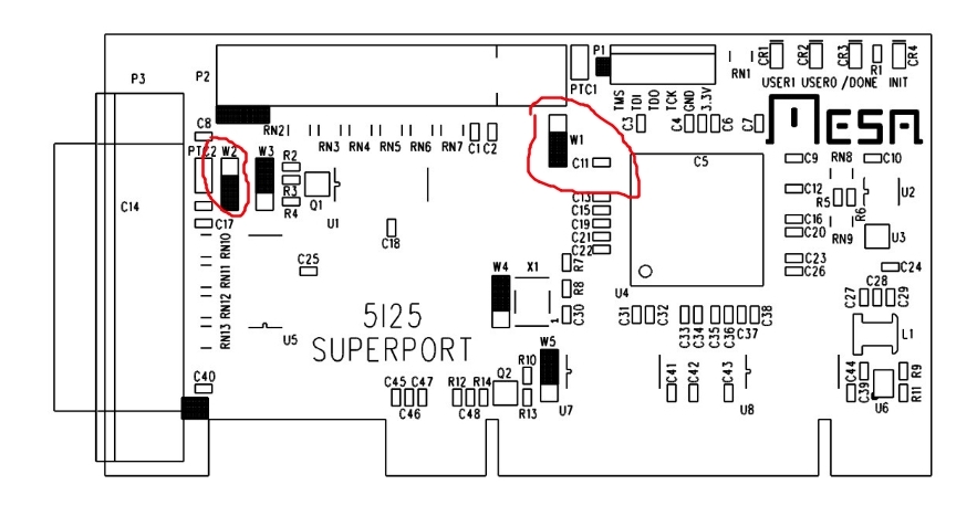 "2. переключатели W1 и W2 на плате 5i25 в верхнем положении ??"