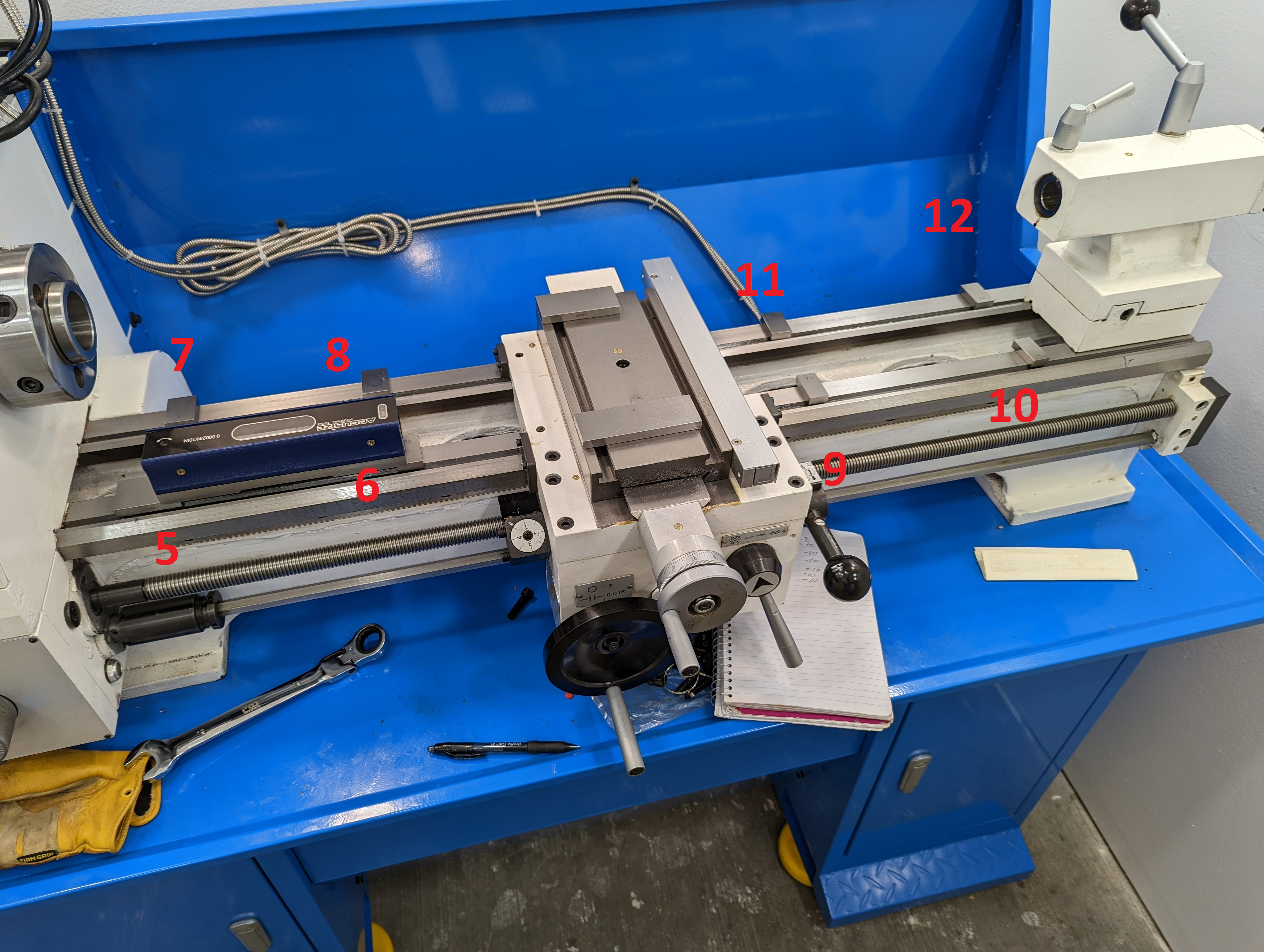 Если под точку 10 положить около 0.6мм стальной фольги то выровнять измерения 1-2 и 3-4 становится сильно проще и даже стоит конструкция на всех ногах, но тогда суппорт катается чуть хуже и сложнее его перемещать плавненько и равномерно возле задней бабки.