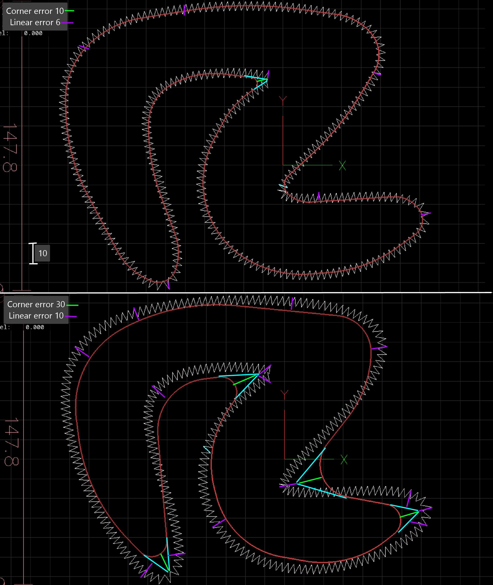 Про то как бывают реализованы алгоритмы G64 я знаю. Повторять за другими не хочу. У меня чуть другой взгляд на эту задачу. Подробно описывать здесь не готов. Если кратко, то большинство планировщиков пытаются решить задачу с точки зрения геометрии, а потом уже двигаться по рассчитанной траектории. А я надеюсь, что получится экстремум системы уравнений (минимальное время) ограничиваясь только физическими законами механики станка, и допустимым отклонением от траектории. С учетом S-ускорения такая система уравнений может иметь бесконечно большое количество решений, но мне ведь не нужно все их искать, и решать задачу аналитически. Достаточно численными методами выбрать из множества одно решение с минимальным временем.