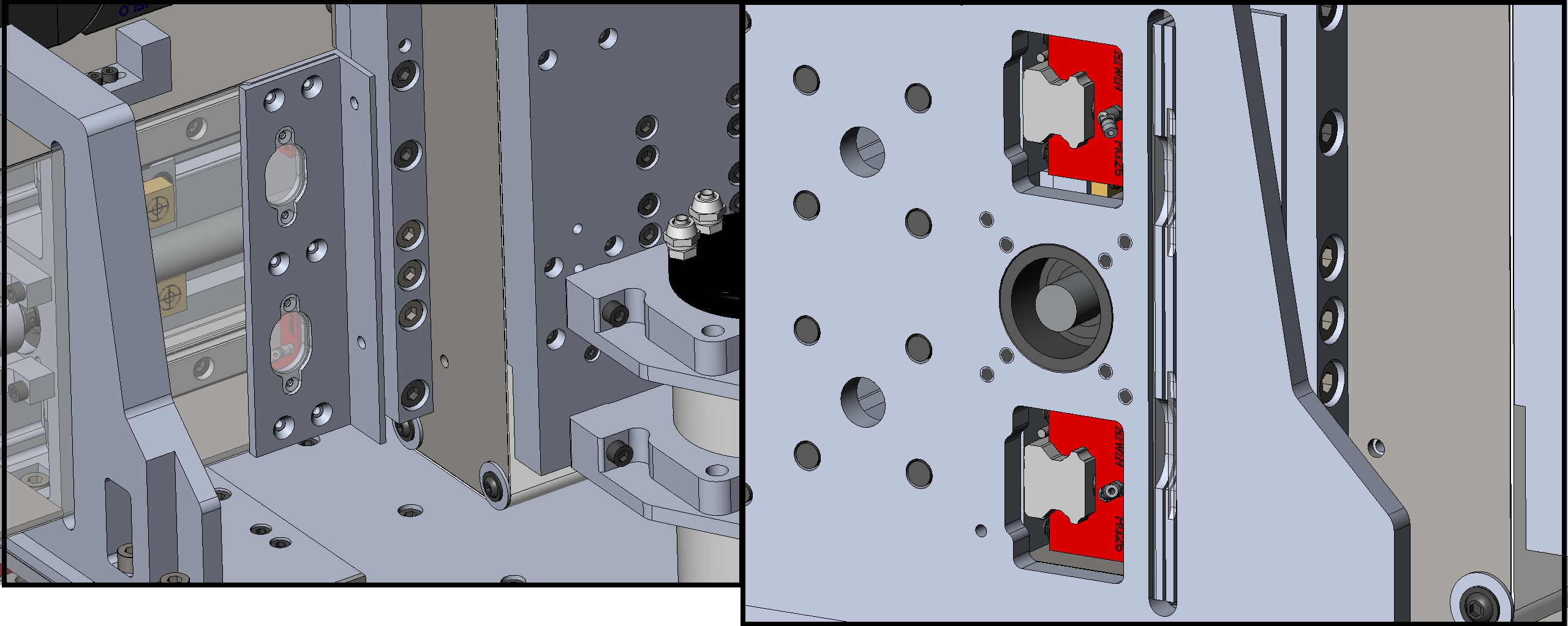 1.2 Для смазки кареток и гайки ШВП по оси Х решил дополнительно сделать окна в листах боковой защиты на Х, это обеспечит беспрепятственный прямой доступ к тавотницам с каждой стороны оси Х, если по какой-то причине не получиться вывести шланги смазки через опоры портала Y (на картинке отверстия планируемые для вывода трубок выделены красным), в любом случае окна лишними не будут, это позволит оценивать обстановку внутри без снятия ленточной защиты Х.