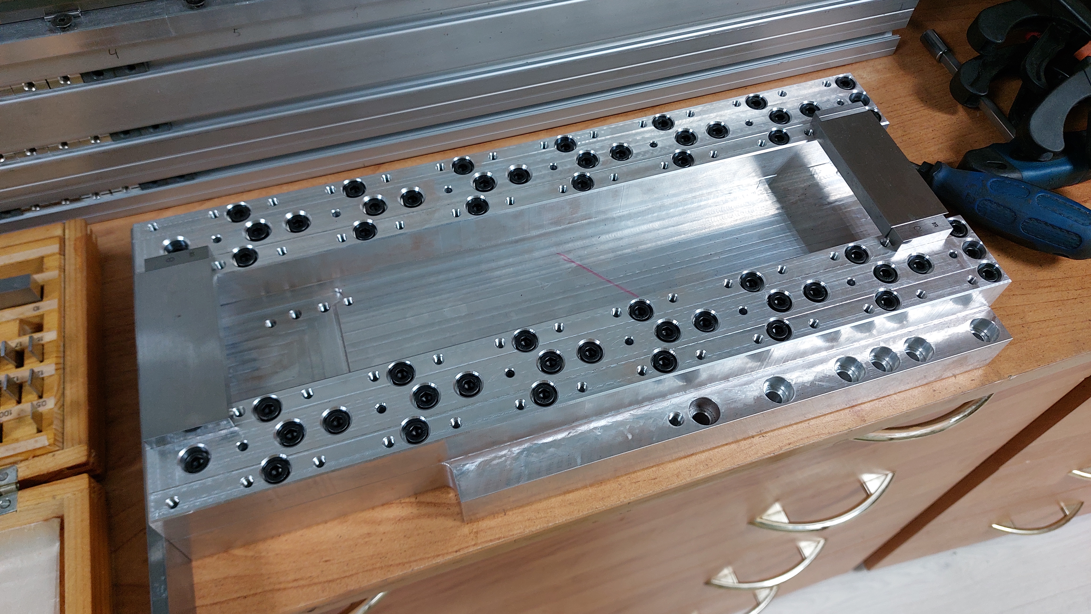 Нет, не так. Грубо говоря у меня 24 прямоугольных профиля стола, с каждой стороны в каждом профиле по 4 отверстия, при этом 2 из них сквозные диаметром 7 мм, а следующая пара с резьбой М6, т.е. первые 2 болта вкручиваются снизу в сухари в профиле, а следующая пара вкручивается тоже снизу, но она вкручивается только в пластину 20мм в те самые М6. Это обусловлено следующим - если нет на профилях пластины 20 мм, то винты тянут верх прямоугольных профилей к балкам профиля 100х100, но сухарь в этих профилях не доходит до самого низа паза в балках и получается эффект всасывания одеяла в щель - низ утягивает вверх в свободное пространстьво, а поскольку нижние прямоугольные профиля из достаточно мягкого алюминия, их начинает вытягивать, эффект на фото выше был показат (нидно как паз от балки отпечатался на нижних профилях стола. Если ставить промежуточную пластину 20 мм, то нижние профиля прилегают своей верхней плоскостью к плоскости пластины 20мм и вытягиваться не могут из за толщины (пластину Д16Т в щель уже не засосать). Это вынужденная мера, ну конечно если больты сильно не затягивать (я хорошо протягиваю), то можно обойтись без верхней пластины 20 мм, т.е. тянуть так, чтобы балки притягивались иудерживались на эффекте терния, но при этом не получить эффект всасывания в щель паза 10 мм балок.
