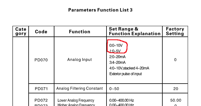 В параметре PD070 у меня стояло почему то 1 тоесть 0-5в. ПРи этом шпиндель крутился только до 9500. Я поставил параметр 0 ( 0-10в) хотя в статье у него при этом не управлялось ничего и он поставил 4 параметр. Я и его тоже ставил. Но упарвления нет оборотами и выше 11500 не показывает.гражданинъ писал(а): ↑25 фев 2024, 19:30 Ещё в настройках частотника бывает переключение напряжения 5-10 вольт .