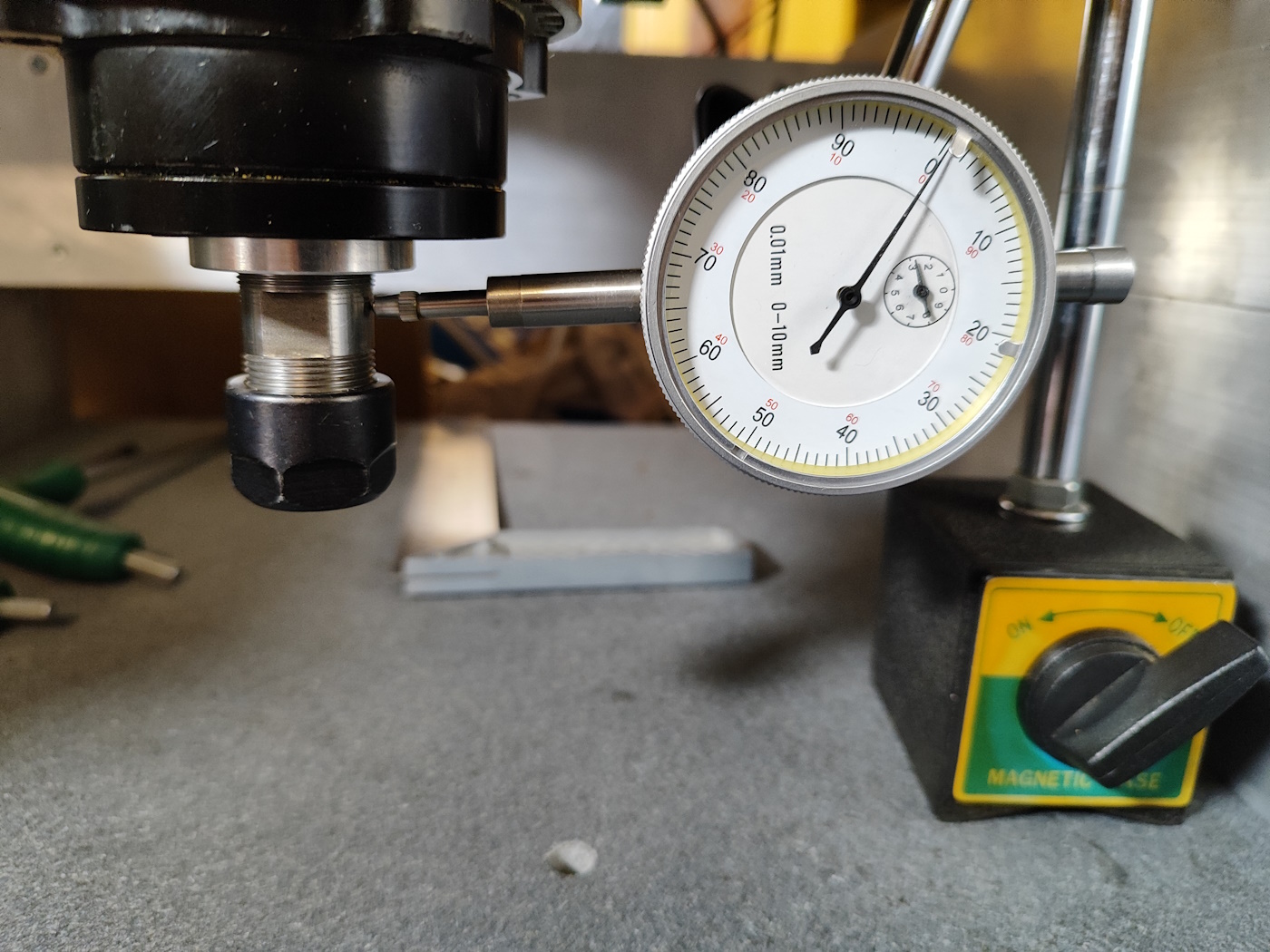 Продолжаю потихоньку собирать станок. Прикрутил концевики, установил шпиндель и, конечно, провёл "стандартный" тест жёсткости станка с электронным безменом. Правда давил с силой всего 5 кг - больше было неудобно, да и мало ли что...