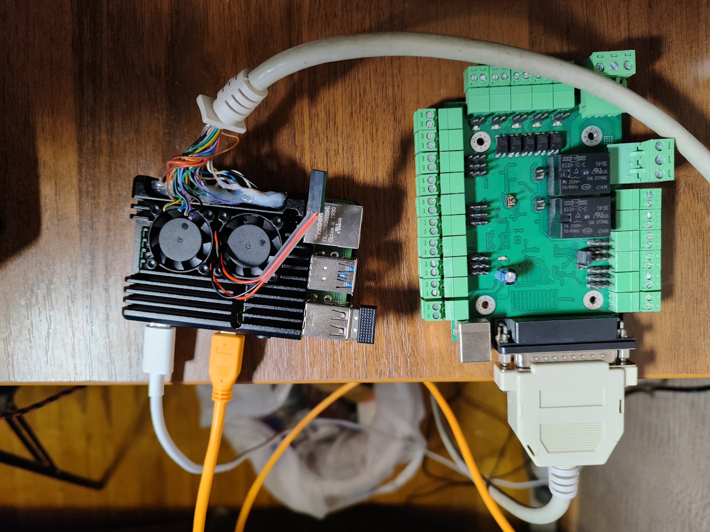 Изначально планировал использовать IDE кабель, благо его разъёмы подходят к Raspberry Pi. К сожалению оказалось, что жилы IDE делали из стали/железа/какой-то дряни, которая совершенно не хочет паяться ни при каких условиях. Убил на попытку целый день, так ничего и не добившись. В результате "родилась" конструкция на основе разъёма 40-pin от IDE, куда вставлены оголённые провода от кабеля LPT, зажаты механически (хотя надёжнее было бы запаять, да) и сверху всё это безобразие залито поксиполом, чтобы не развалилось прям сразу. Все контакты, кроме, может быть, одного, прозваниваются, так что пока сойдёт, а ближе к окончанию работ переделаю. Нужно ещё щиток придумать как и где располагать, куда в нём что крепить... В общем с электроникой ещё придётся повозиться, но в целом до запуска станка осталось недолго.