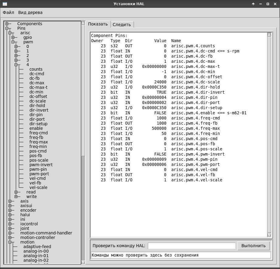 Как увидеть все интересующие сигналы средствами linuxcnc? Как я понял, в нем аж 3 способа: Установки HAL, HAL-meter и HAL-scope. Выбираешь нужные сигналя и на них смотришь.