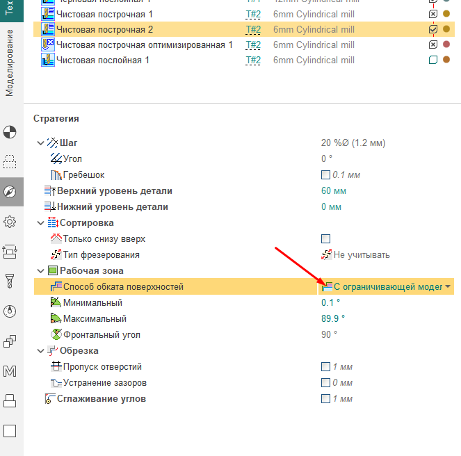 Из нескольких найденных "косяков" вот этот пока самый неприятный: В чистовой построчной обработке фреза частично проходится по поверхностям, к-рые задано "не обрабатывать". Подписано цифрой 1.