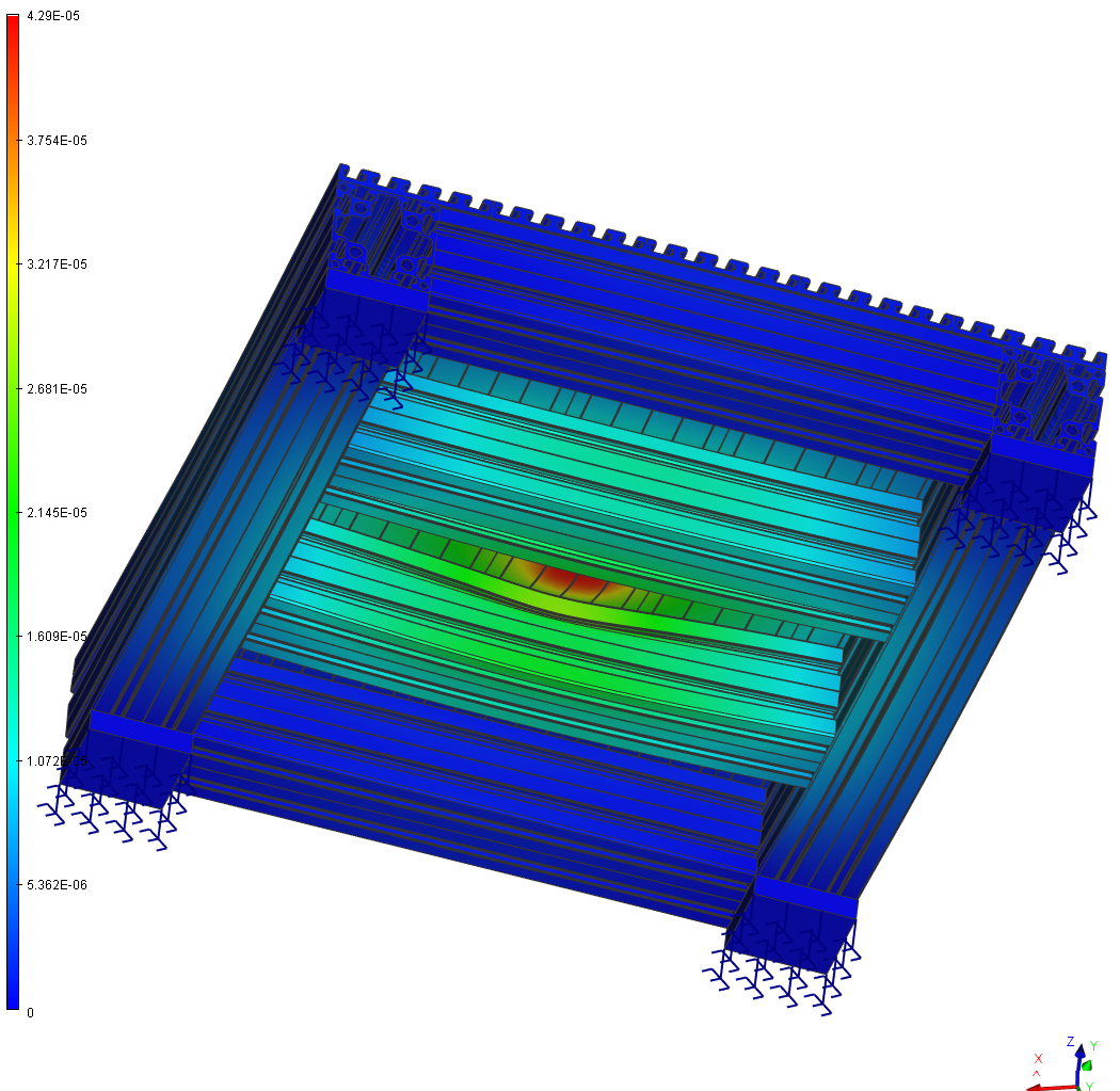 кстати хорошо видно что стол вдоль гнется сильно легче. вдоль тройной бутер не работает так трубы тут не мешают смещаться плитам относительно друг друга. тут бы какую то решетку в качестве спейсера меж плитами. как будет себя вести все это при скручивании мне не оч понятно так как под порталом скручиванию будет портал еще мешать.