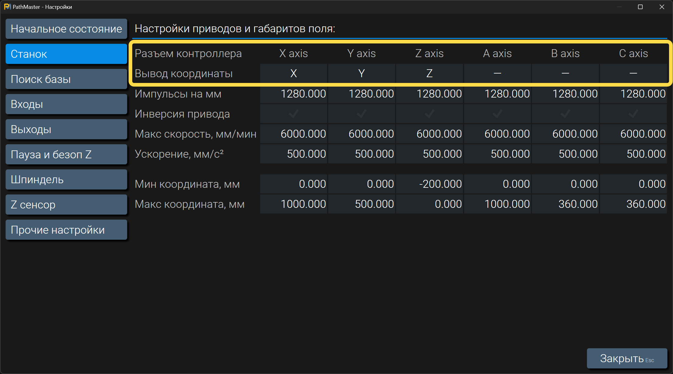 Т.е. на одну программную ось может быть назначено несколько приводов (выходов контроллера). Для каждого привода свой датчик базы.